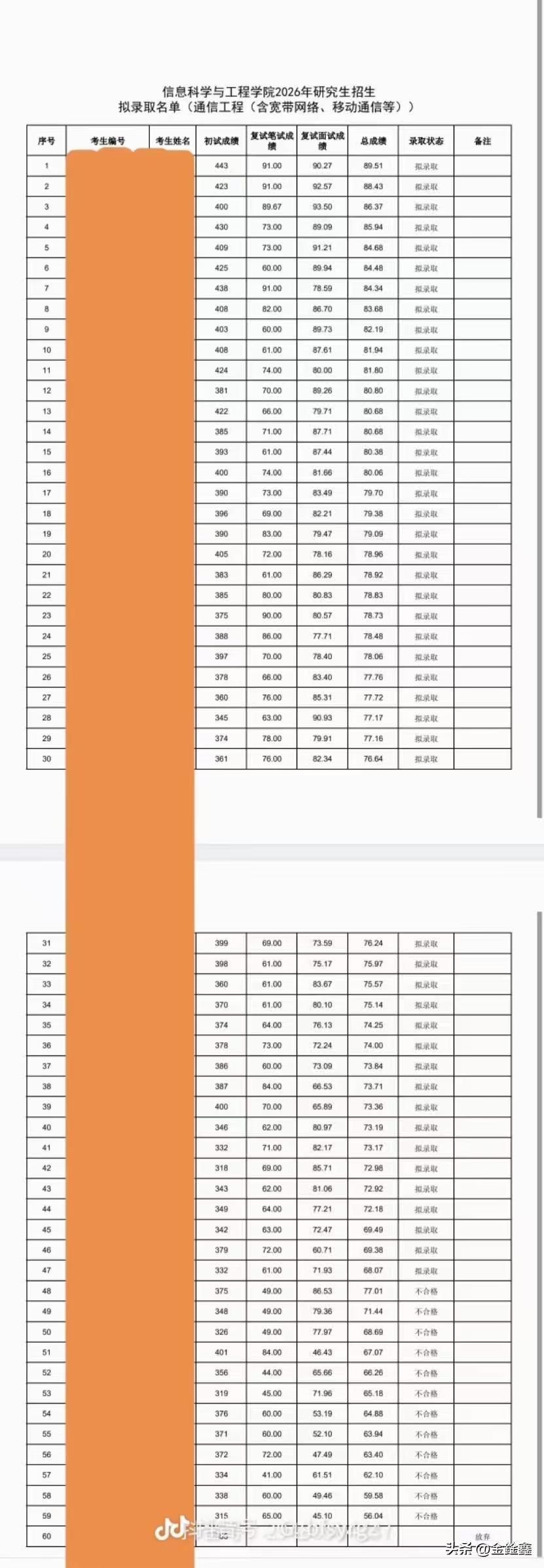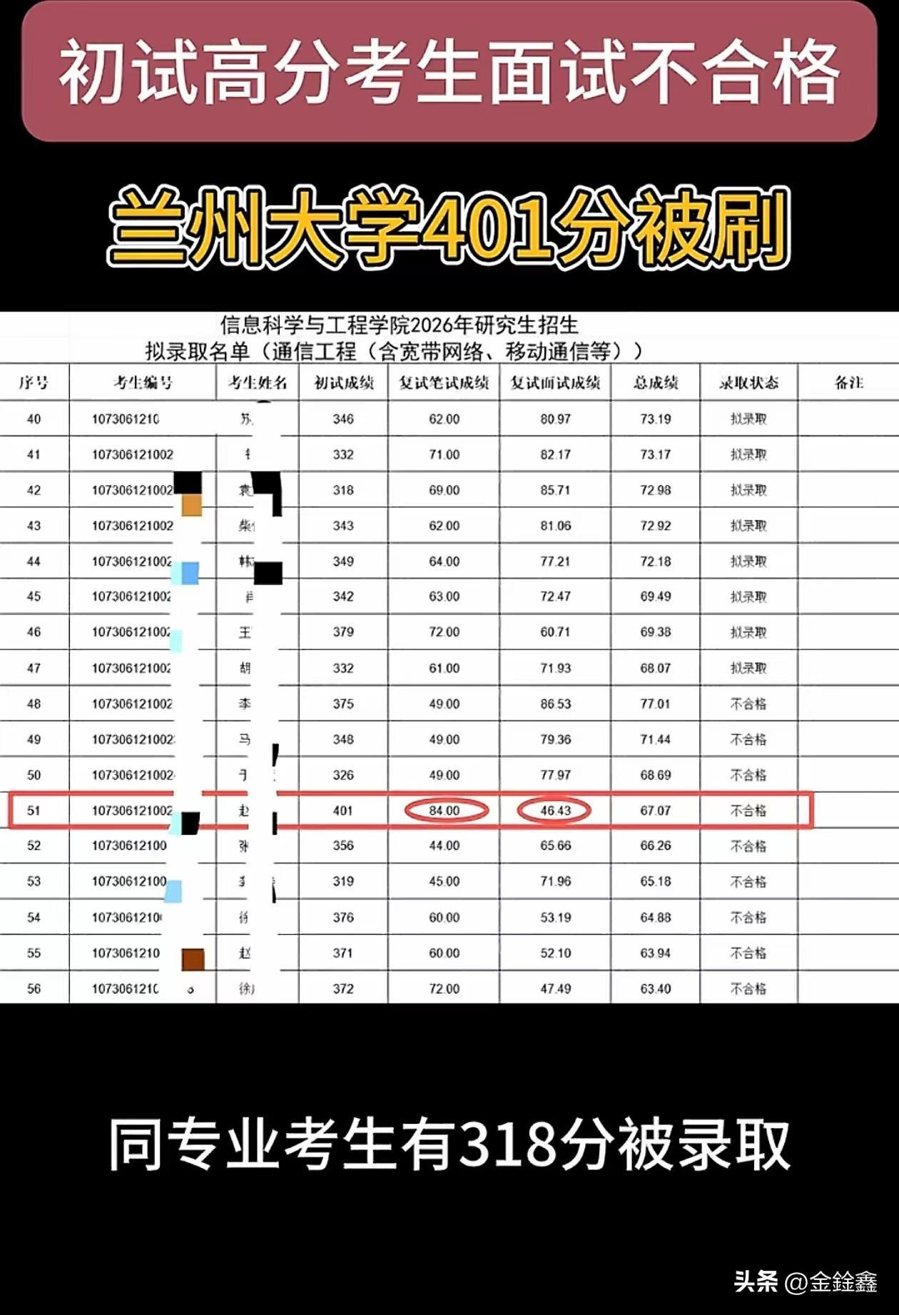 401分被刷,318分录取?兰大通信考研的“逆袭”真相 兰州大学通信工程考研复试结果引发热议:一名初试401分的考生被刷,而318分的考生却被录取。 这并非“黑幕”。根据兰大信工院公开的复试规则,总成绩由初试、复试笔试和面试按50%、10%、40%的权重构成,且面试不及格将直接淘汰。 401分考生复试笔试84分,但面试仅46.43分(不及格),导致总成绩被拉低。318分考生复试笔试69分,面试高达85.71分,凭借面试高分实现反超。 这并非歧视,而是规则透明下的正常结果。考研是综合选拔,复试表现同样关键。 信息及数据来源:兰州大学信息科学与工程学院2026年硕士研究生招生复试录取办法及拟录取名单。