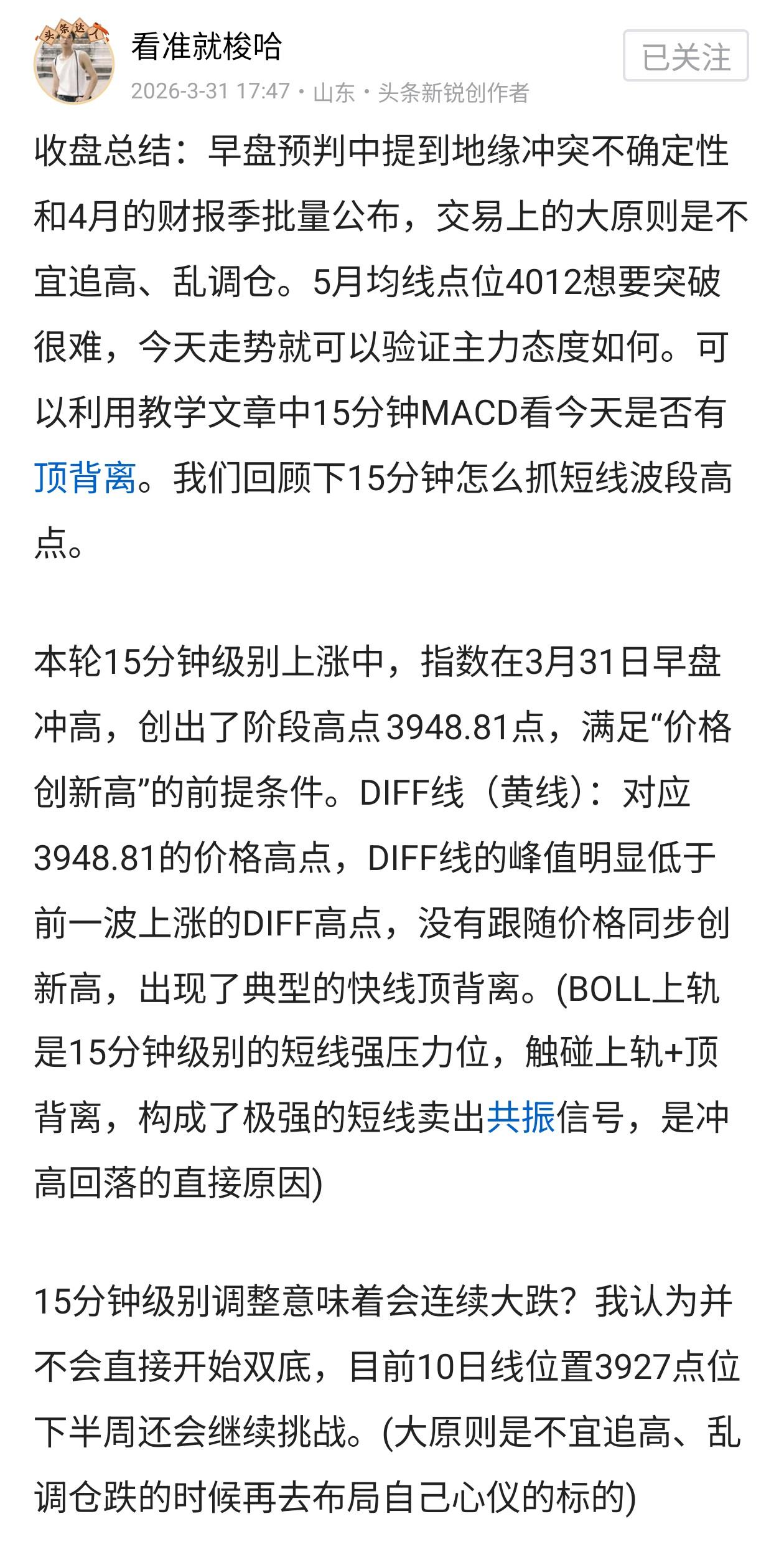 早盘预判:昨天收盘总结讲到15分钟级别调整并不会导致直接开始回踩双底,下半周还会继续往上补全缺口。还会继续往上突破10日线3927点位,周二下蹲我定义为蓄力。有大V带着选择清仓式割肉我认为是错误的。(这个位置对于低仓位是是拿筹码的机会,我们保持8层左右即可) 今天大盘会怎么走?今天上证指数就会完成蓄力动作再次冲上去先去挑战10日线站稳后再次补全缺口,今天看涨。(还是那句话最难时候已经过去回踩就算4月初回踩双底我们布局主线板块也不会跌破前低也会比指数优先企稳) 比如科创芯片、半导体设备看筹码结构主力底部区域筹码毫无松动,说明主力对未来高度充分自信。(这个位置已经回踩双底一定要珍惜底部区域可以布局机会)大原则是不宜追高、乱调仓跌的时候再去布局自己心仪的标的 A股的未来会怎样 我们来谈谈期货