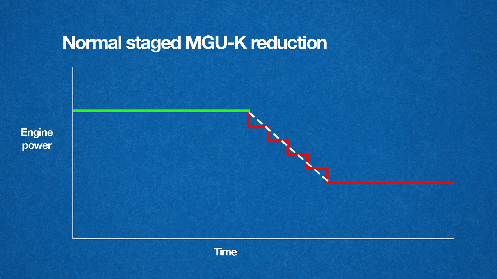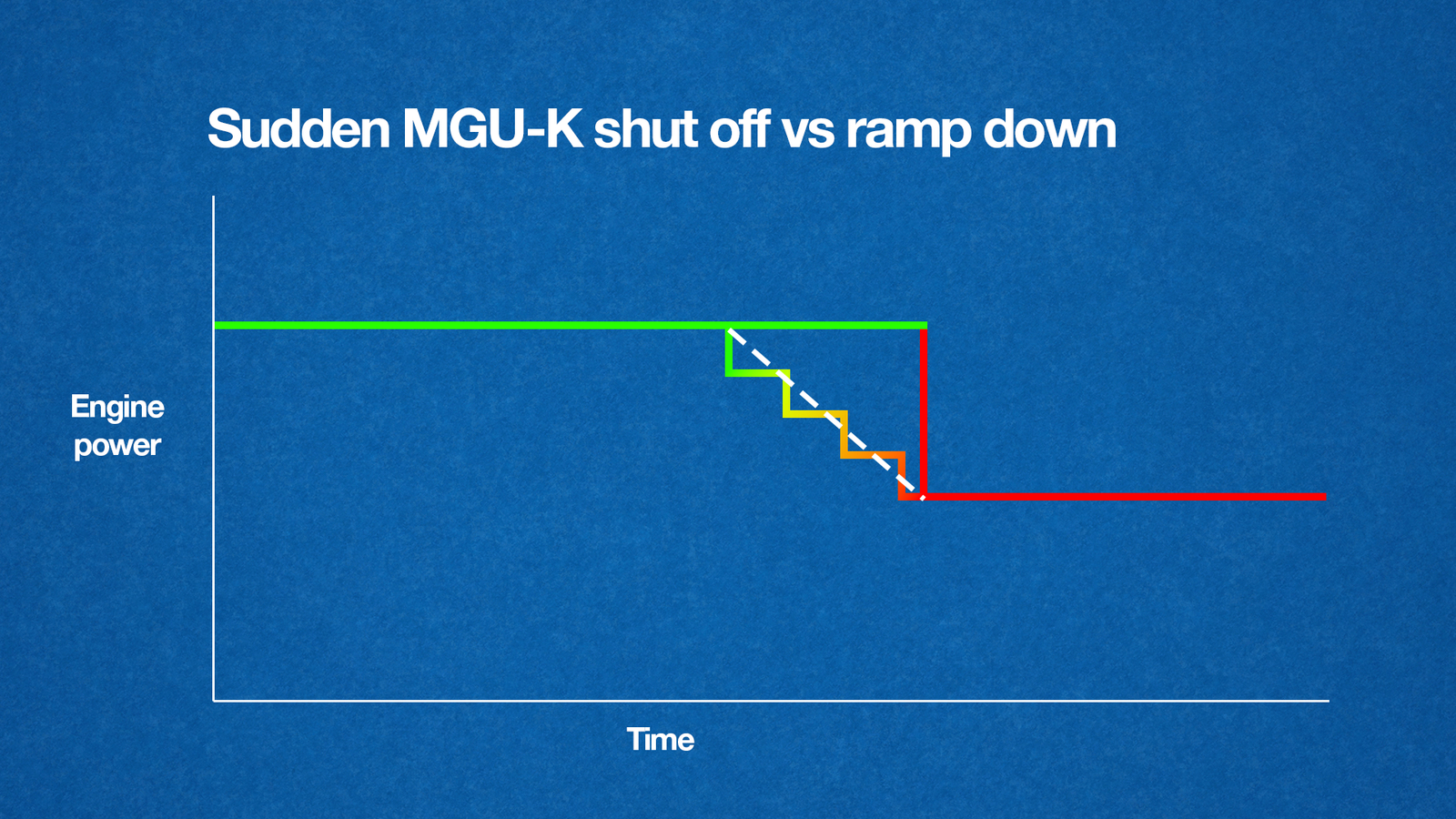 根据规则,MGU-K的能量释放通常需要分阶段逐步降低。简单来说,就是以每秒约50kW的幅度慢慢下降。也就是说,在出弯全功率释放电能之后,到了直道的某个阶段,动力会被逐步削减。