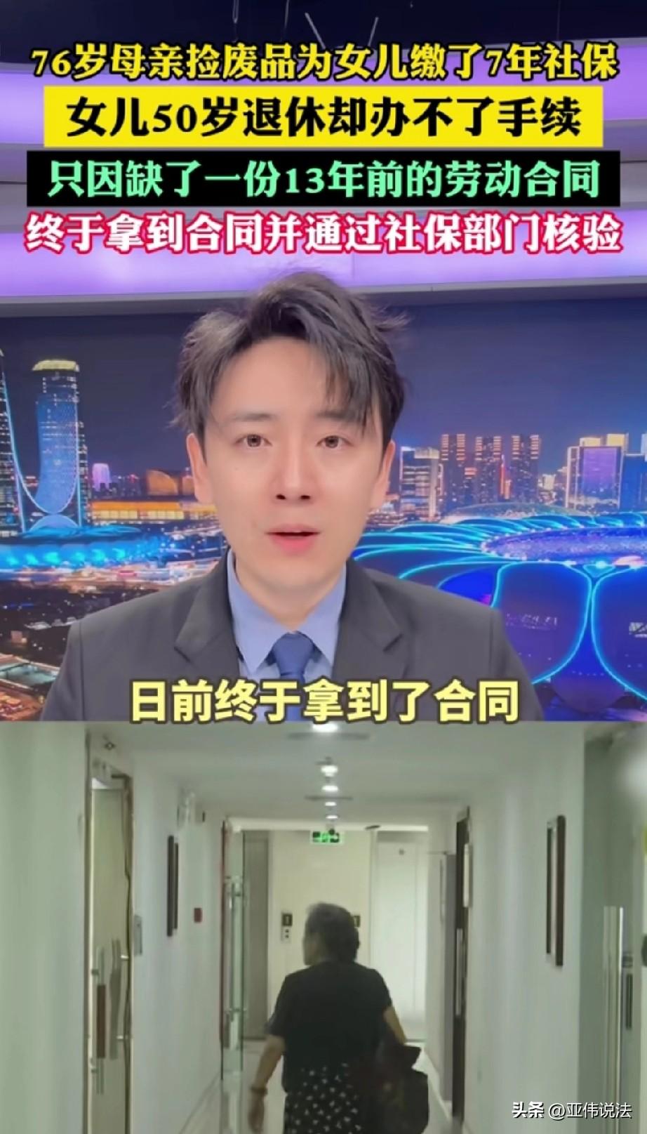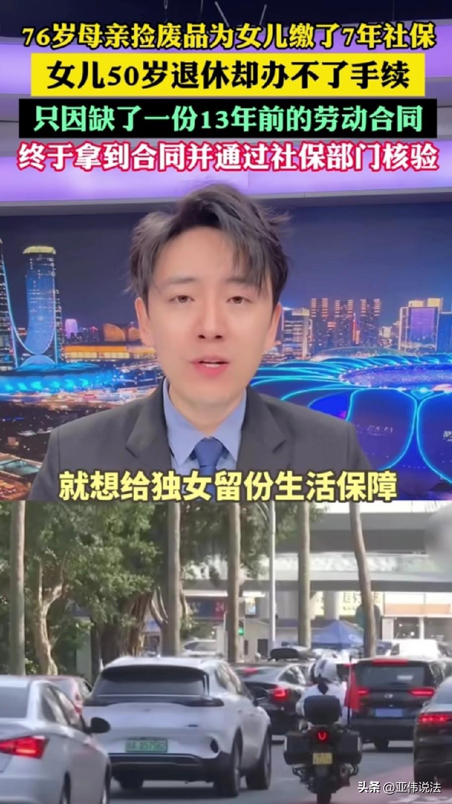 沉甸甸的母爱!海南海口,女子患有抑郁症,76岁的母亲捡了8年废品养活女儿,可祸不单行,一年前女子意外摔倒,导致半身瘫痪,完全失去了自理能力。为了给女儿日后留份保障,母亲拿出积攒的退休金和捡废品的钱,为女儿缴纳了7年社保。终于等到女儿50岁,可以办退休领钱时,却发现缺了一份13年前的劳动合同。头发花白的母亲没有放弃,多地奔波,终于解决了难题。 76岁的余阿婆弓着背,手里攥着一个皱巴巴的蛇皮袋,正低头在垃圾桶里翻找废品。 这是她坚持了8年的日常,只为给瘫痪的独生女攒一份未来的保障。 余阿婆的女儿从年轻时就患上了抑郁症,情绪时好时坏,连正常工作都难。 看着女儿孤零零的模样,余阿婆心里像压了块石头,总怕自己哪天走了,女儿没人照顾。 退休后,她靠着微薄的退休金过活,可还是觉得不够,于是每天天不亮就出门捡废品,风里来雨里去,就想多攒点钱,给女儿留条后路。 但祸不单行,2025年,一场意外彻底击垮了这个脆弱的家。 女儿在意外摔倒,送到医院后命虽然保住了,但落下半身瘫痪,吃饭、穿衣、上厕所都需要人伺候,生活完全不能自理。 看着躺在病床上的可怜女儿,满头白发的余阿婆泪流满面,差点就撑不住了。 可一想到女儿以后的日子,她又咬着牙站了起来,把这些年攒的退休金和捡废品的钱凑在一起,给女儿缴上了中档社保。 自己早晚要走,以后社保就是她的依靠,每月能领点钱,至少饿不着。 好不容易熬到女儿50岁,到了可以申领养老金的年纪,余阿婆揣着准备好的材料,跑到社保部门,谁知,却被一盆冷水浇了个透心凉。 工作人员表示,女儿2000年到2013年在一家公司工作,必须提供那段时间的劳动合同,不然办不了手续。 余阿婆一下子懵了,这么多年过去,女儿连自己的东西都收拾不利索,那旧合同早就不知道丢哪去了。 可一想到女儿以后的生活,她不敢放弃,当天就跑到女儿上班的公司打听,对方却说公司早就搬迁,资料都转到广州总部了。 76岁的老人,凭着一股韧劲,开始在海口、广州、北京三地奔波。 她坐十几个小时的火车,在陌生的城市里找路、问人,累了就在火车站的长椅上歇会儿,饿了就啃个面包。 每次打电话问进展,她都攥着手机手心冒汗,生怕得到“找不到”的答复。 就这样焦急地等了十几天,终于有好消息传来,那份尘封的劳动合同,找到了。 余阿婆拿着那张薄薄的纸,手抖得厉害,这不仅是一纸合同,更是女儿以后的指望。 她赶紧把合同送到社保部门,顺利通过了核验,这下,余阿婆悬了大半年的心,终于落了地。 如今,余阿婆还是每天出门捡废品,只是脚步比以前轻快了些。 她知道,自己陪不了女儿一辈子,但有了这每月的养老金,女儿以后的日子,总算多了点盼头。 《关于确立劳动关系有关事项的通知》第二条规定:认定双方存在劳动关系时可参照下列凭证: (一)工资支付凭证或记录、缴纳各项社会保险费的记录;(二)用人单位向劳动者发放的“工作证”“服务证”等证件;(三)招工招聘“登记表”“报名表”…… 社保部门仅以“无劳动合同”拒办养老金,不符合法律规定。 劳动关系认定并非必须劳动合同原件,社保缴费记录、工资流水、工作证等均为法定有效凭证。 阿婆女儿2000至2013年有社保缴费,社保系统记录本身就是最直接的法定依据。 社保机构应优先核查系统缴费数据,而非机械要求个人提供丢失多年的合同,此举增加弱势群体不合理负担,违背社保便民与保障权益的立法初衷。 而且,《劳动合同法》第五十条要求,单位至少保存2年,长期档案更应归档留存 。 阿婆女儿原公司将资料转至广州总部,属于用人单位掌握管理证据 。 社保部门本可通过公函协查、跨地域数据共享等方式调取,不应把举证与奔波义务全压在76岁老人身上 。 好在,费了一番波折,这件事终于顺利解决。 这份跨越了十几年、跑遍了三座城市的母爱,最终化作了女儿未来生活的光亮,支撑着这对母女,继续走下去。