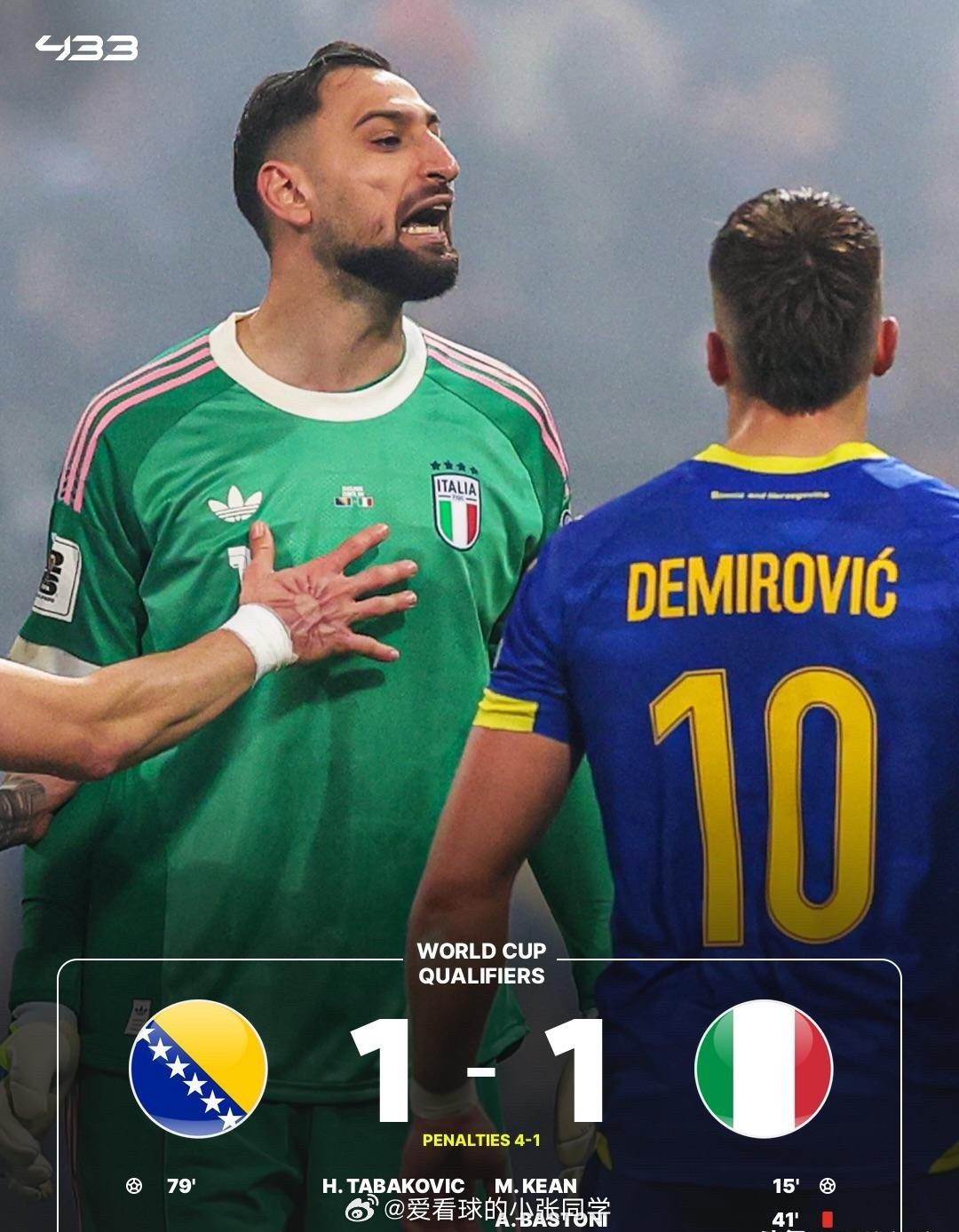 点球环节意大利球员心态崩盘,接连罚失关键点球,反观波黑全员稳健弹无虚发,轻松拿下决胜局。至此,昔日四次登顶世界杯的四星意大利,创下队史极度尴尬纪录:2018、2022、2026连续三届折戟世预赛,整整十二年无缘世界杯舞台。
