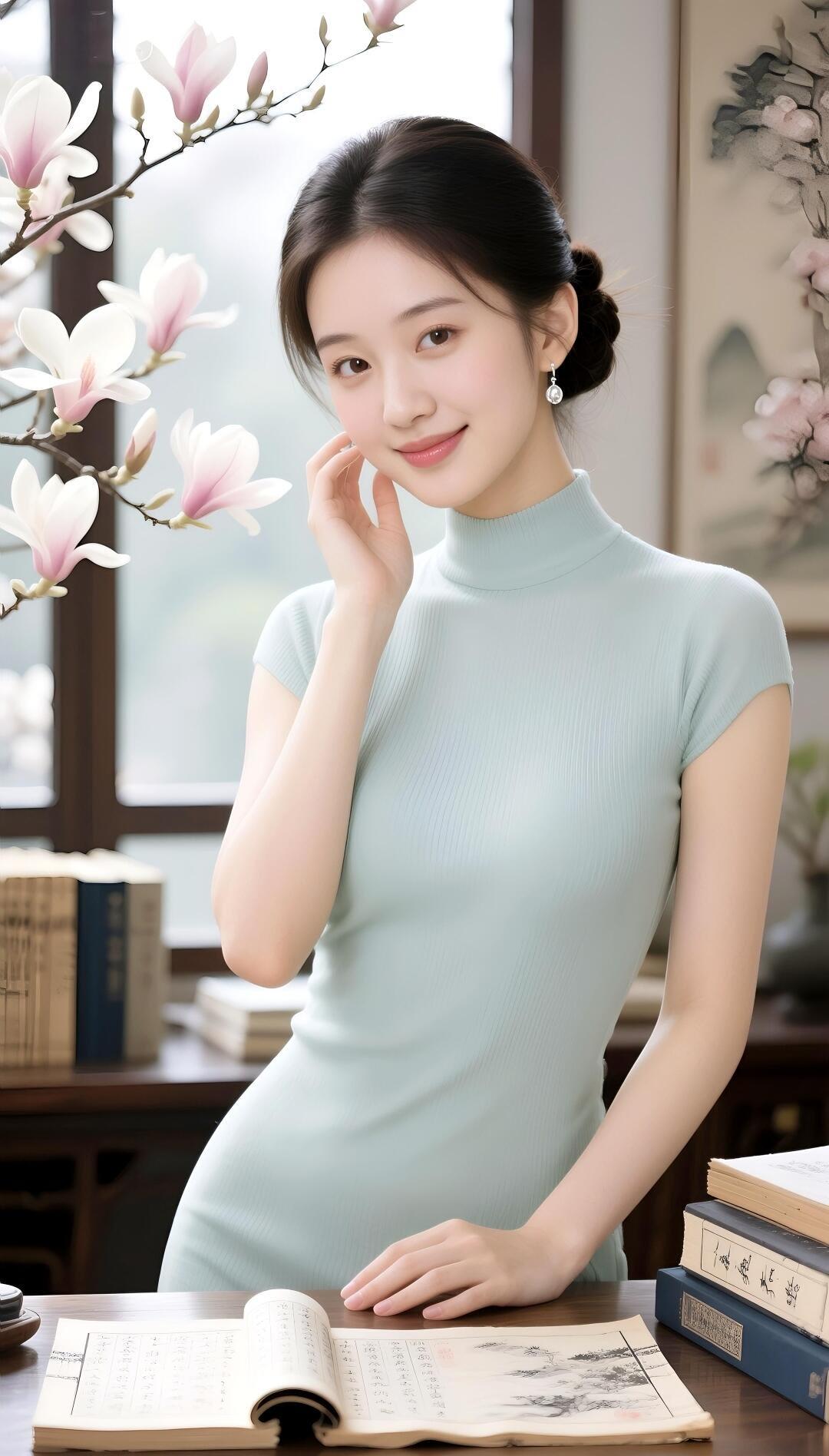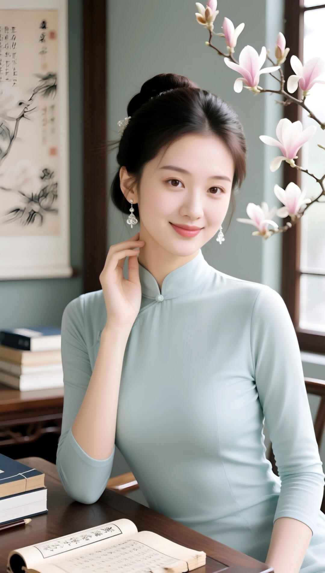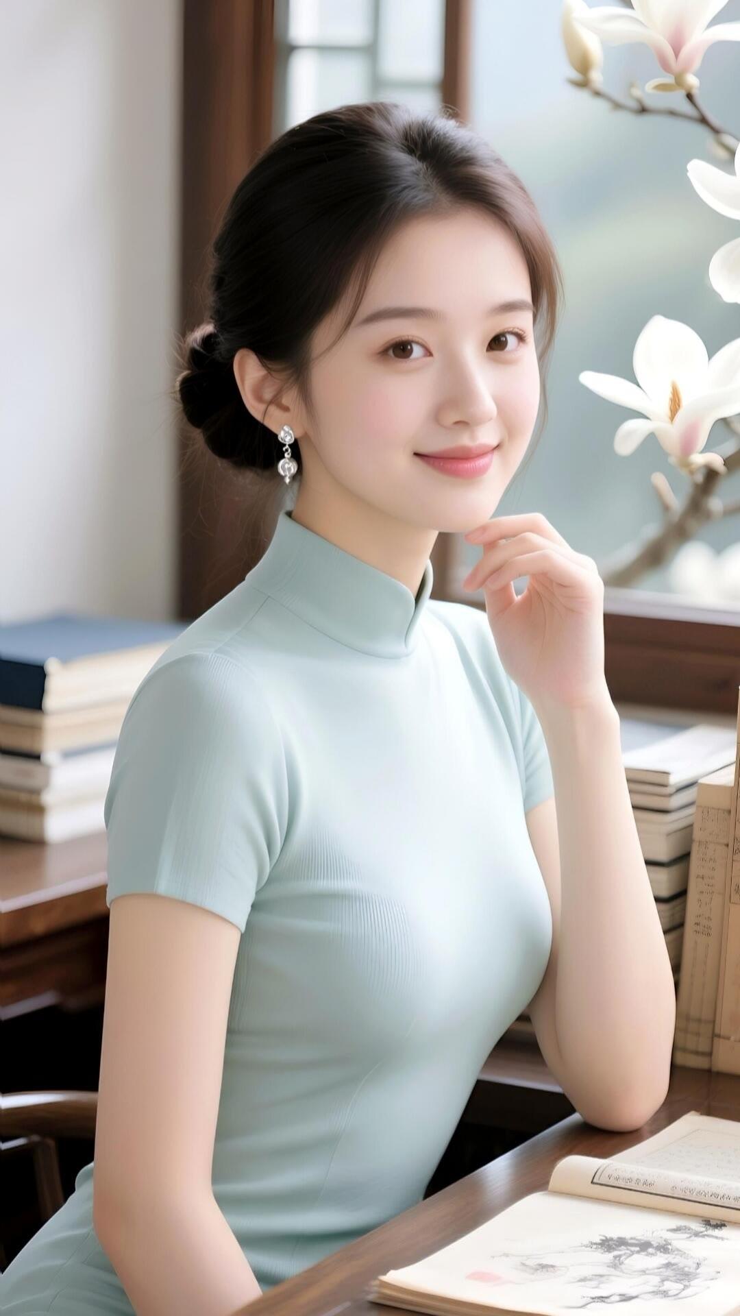 温婉优雅的东方美人,粉色旗袍尽显古典韵味。