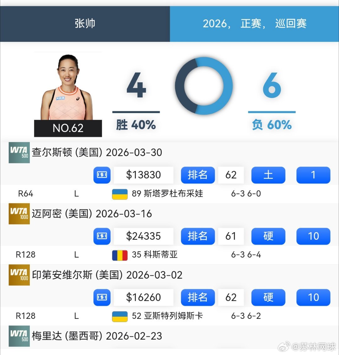 WTA500查尔斯顿首轮幸运落败者🇨🇳袁悦2-6/7-6(4)/7-6(5)谢里芙🇪🇬,逆转了。🇨🇳张帅3-6/0-6不敌斯塔罗布采娃🇺🇦。张帅连续三站一轮游了。袁悦这次没有让机会溜走,收获32分。次轮比赛今晚23:00,袁悦vs科西亚雷托🇮🇹,交手记录:袁悦0-1科西亚雷托加油。网坛风云中国网球wta超话