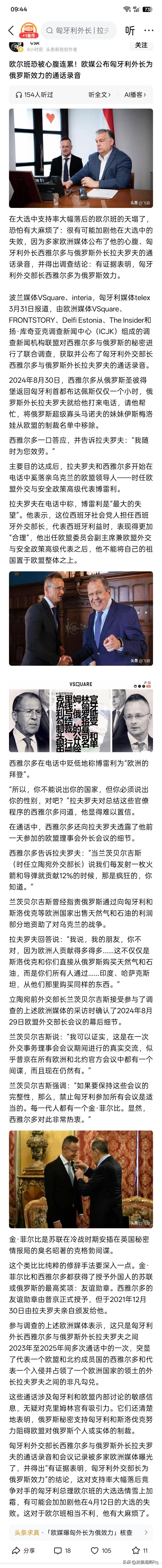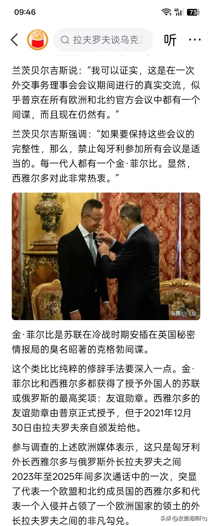 欧尔班再遭一棍子? 虽然看起来都是秘密通话,但仍然是无法藏得住。欧洲的多个媒体联合对匈牙利外交部长西雅尔多,与俄罗斯外交部长拉夫罗夫的关系进行了调查。并且获得了电话的通话内容。 结果好像得出初步判断,西雅尔多可能是在为俄罗斯效力。这差不多就是投入欧盟中的一颗重磅炸弹,估计不仅仅是在欧盟炸响,同时也在匈牙利这个即将在12日进行议会大选的国家炸响。 作为一个北约、欧盟成员国的外交部长,如果在为俄罗斯效力,该是多么骇人听闻,令人惊心动魄的事情?但是,俄罗斯总统普京确实亲自正式授予西雅尔多俄罗斯的最高奖章“友谊勋章”,而这种俄罗斯的最高奖章,据说仅仅授予两人:一个是匈牙利外交部长西雅尔多,另一个就是俄罗斯安插在英国秘密情报局的克格勃著名间谍金·菲尔比。