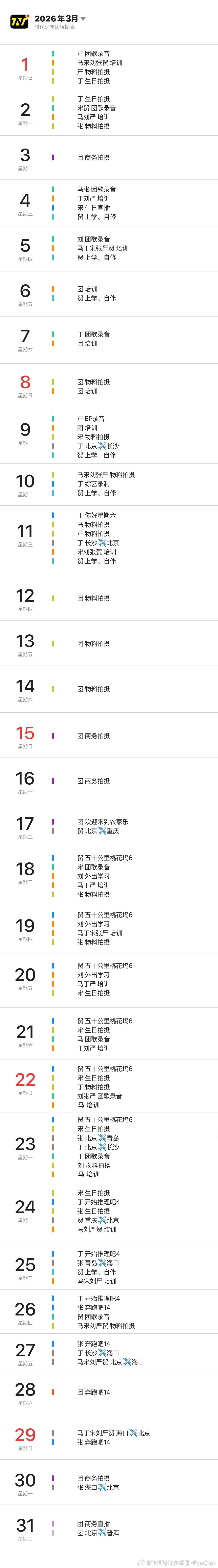 时代少年团三月行程表时代少年团又要发团歌了 时代少年团三月行程表来啦! 行程表里有团歌录音,这是又要发团歌了吗?一整个期待住啦!