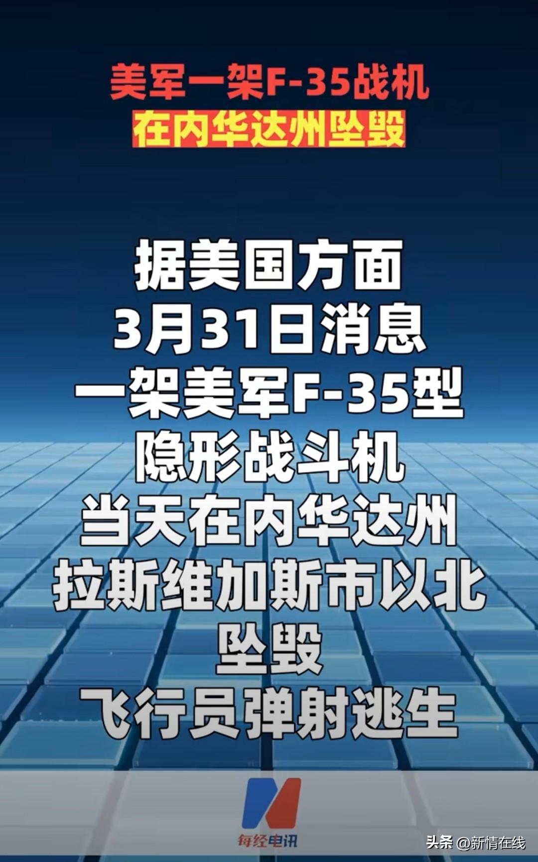 又摔了!美军F-35坠毁,飞行员弹射逃生 当地时间3月31日,据美国媒体报道,一架美军F-35隐形战斗机在内华达州拉斯维加斯以北的区域直接坠毁,飞行员成功弹射逃生,目前只受了轻伤,已经被送去救治了。 出事的这架F-35隶属于内利斯空军基地,事发地点在印第安斯普林斯镇东北大概40公里的位置,属于内华达试飞训练区的联邦受限空域,好在是军事禁区,远离居民区,没造成地面人员伤亡和民用设施损坏,算是不幸中的万幸。 按照美军的通报,战机是中午前后飞行时突然报告操控系统异常,之后就失控坠机了,具体是什么原因导致的故障,现在还没公布,美军也说正在调查。 说真的,F-35作为美军吹了这么多年的全球顶尖五代机,这几年摔机的频率真的有点高。不管是训练故障、零部件问题还是其他原因,接二连三出事,也让这款战机的“神话”一次次被打破。 造价高昂、号称隐身无敌,结果动不动就出事故,要么坠毁要么迫降,连日常训练都稳不住,也难怪越来越多人质疑这款战机的实际可靠性。 目前坠机现场已经被封锁,后续调查结果估计还要等一阵子,只能说美军这五代机的面子,真是一次又一次被摔没了。