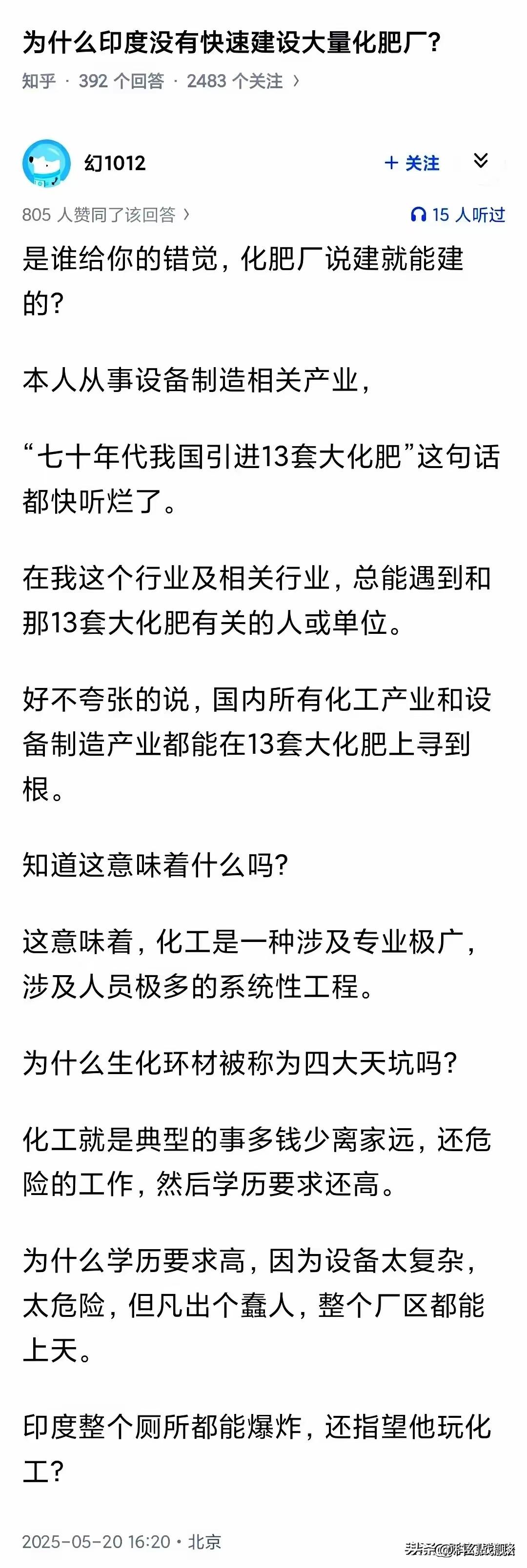 印度又不是没玩过 死了几十万人[捂脸] 印度不是没搞过化肥,但玩砸了,代价是几十万条人命。这就是历史上著名的博帕尔毒气泄漏事故。 一个镇上的人,差不多全被毒死了。那种毒气比空气沉,闻着像烂苹果,人吸进去就剧烈咳嗽,肺像要咳出来,很快得肺水肿。就因为他们工厂生产不严格,毒气漏了。 说回化肥。好多人觉得,造化肥有啥难的?其实大错特错。能生产化肥,和能用便宜的成本生产化肥,完全是两码事。 这里头技术很难,算是人类科技最前沿了。上天下海的技术,跟造化肥的技术都是相通的。所以全世界,能玩转大型化肥厂的,也就中美俄,再加个法国。 印度为啥玩不转?首先,他家缺原料。造化肥要的原油、天然气、煤,印度都少。巧妇难为无米之炊。 更要命的是技术和管理。印度博帕尔那个厂,就是管理和技术跟不上,才闯下滔天大祸。 再看咱们中国,这条路走得也艰难。1972年,咱们搞了个“45引进”,花45亿美元巨资,从西方买合成氨、尿素的生产线。目的就是为了学会,然后自己造。 这一学,就是几十年。直到2011年,咱们才真正搞成功,能完全自己建造合成氨和尿素生产线了。从引进到完全国产化,用了将近40年。 网友说得对,最早的化肥我们叫“肥田粉”,是进口的硫酸铵。后来的尿素、磷酸二铵,也全是进口。现在呢?全变成国产的了。 爽的是,咱们走过来了。再难的技术,咬牙也就攻克了。现在很多人吃饱了,开始说化肥农药不好,要纯天然的。他们忘了,没有化肥农药的大批量生产和应用,好多人还得饿肚子。 印度那次事故,是个惨痛的教训。它说明,工业这东西,光有野心不行,得有过硬的技术和严格的管理。否则,就不是造福,是造孽。 咱们能吃饱饭,能用到便宜化肥,是靠几代人扎实干出来的。这份自力更生的本事,最踏实,也最让人放心。