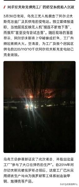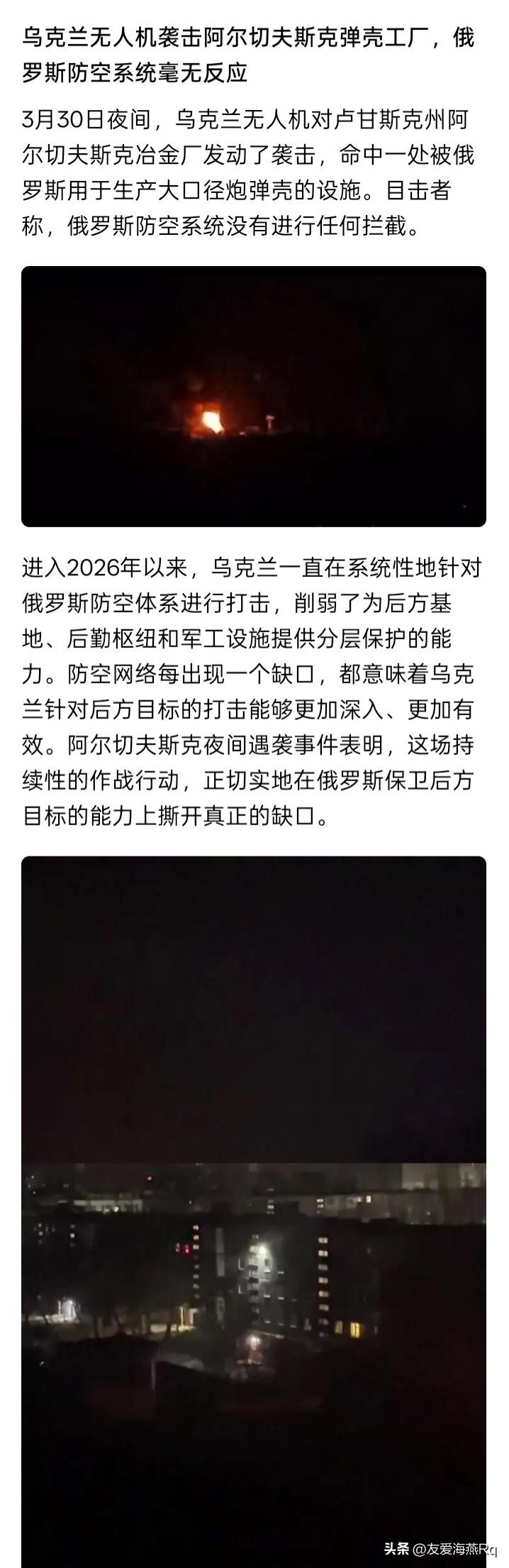大事不妙? 自从俄罗斯占领了乌克兰的卢甘斯克州之后,阿尔切夫斯克冶金厂,似乎就从生产民用产品改为生产大型炮弹的外壳,妥妥的军事产品。 既然是俄罗斯占领的乌克兰领土,不用多说距离乌克兰不太远,差不多就是属于前线地区,防空武器系统应该是早有布防。但是,3月30日的夜晚,当乌克兰的无人机对这个现在生产军工产品的企业进行袭击的时候,竟然有传闻说,俄罗斯的防空系统没有任何反应,任凭乌克兰的无人机肆意妄为的袭击和轰炸。与此同时,不仅仅是对冶金厂实施了破坏,而且摧毁了为冶金厂以及附近居民提供电力的变电站。 俄罗斯土地面积全球第一,并且又占领了乌克兰东部的数10万平方公里的土地,但防空武器系统要面对的区域也远远超过一般的国家和地区,这无疑又是一个软肋。 实际上,现在面临的问题,并不是占领了多少土地,而真正的问题是,如何有效的保护现有的土地。