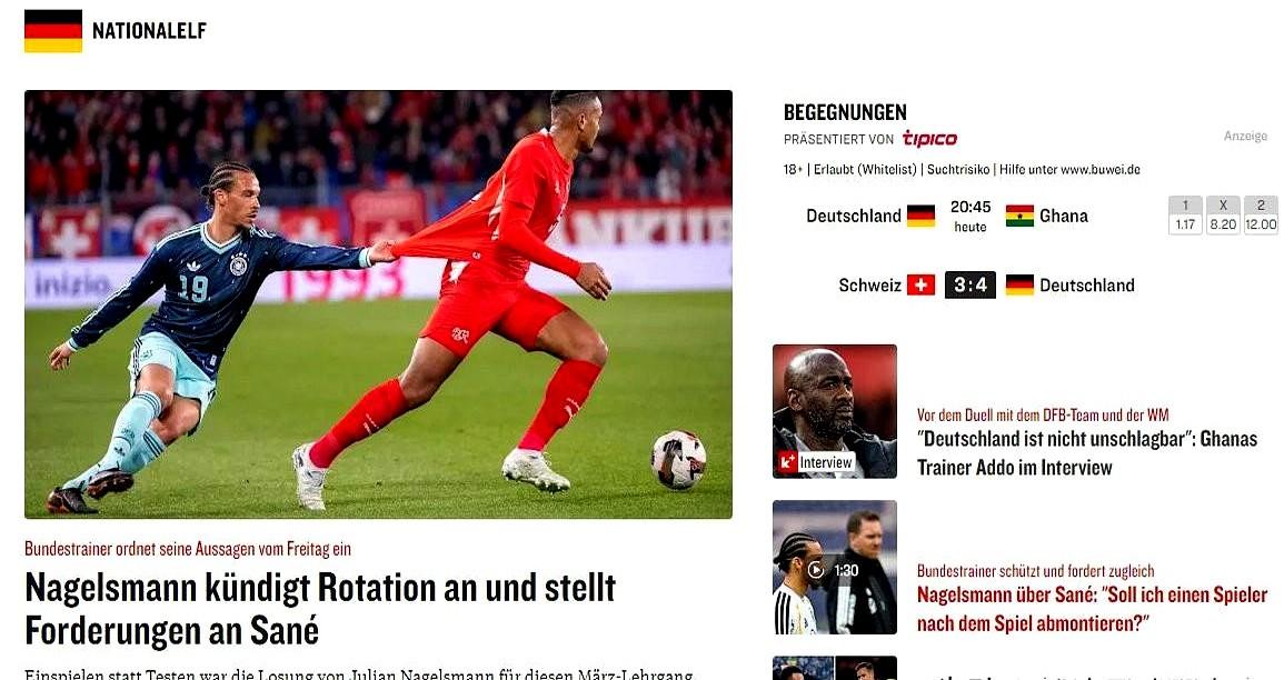 德国队这选人,真把球迷给看急了! 《踢球者》头版直接开炮,就差把“纳格尔斯曼偏爱萨内”写脸上了。球迷和媒体都一个意思:萨内进攻没威胁,防守不积极,凭啥还稳坐主力? 纳格尔斯曼倒挺坚持,说萨内有独特的右路内切能力,队里没人能替。还公开力挺:“只要健康,他就是重要球员”。哈曼、巴贝尔这些名宿都看不懂,说给年轻人机会不好吗? 就连世界冠军队友都曾建议别带他去世界杯。可教练就是看好他,甚至说在加拉塔萨雷表现不错,防守态度都好了。 这关系是真好啊,萨内也说为国效力是荣幸。但这状态,2026世界杯真能指望上吗?