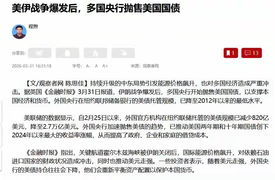 特朗普失算了!才表态认输,话音刚落美债一片绿,遭遇大规模抛售 当地时间3月31日,特朗普在白宫突然宣布:美国将在两到三周内结束对伊朗战争 。 话音未落,全球市场用脚投票——美债收益率全线大跌、价格急挫,一片惨绿,大规模抛售突袭债市 。 本想靠“停战”安抚市场、收割一波,没想到算盘打空,特朗普这次彻底失算。 一、认输式表态:一边喊胜利,一边急撤兵 特朗普的讲话充满矛盾: - 军事强硬:宣称已“彻底摧毁伊朗导弹设施、通信与防空系统”,阻止伊朗核武目标“已经实现” 。 - 急着撤兵:明确“两到三周内离开伊朗”,甚至放弃霍尔木兹海峡安全责任:“航道安全是法国等使用国的事,与美国无关”。 - 留有余地:一边说伊朗出现“更理性新领导层”,一边威胁“伊朗重启核计划,必再军事打击” 。 市场一眼看穿:这不是胜利,是被迫止损、认怂退场。 持续一个月的中东战事,油价飙涨、全球通胀抬头、美国内抗议不断、盟友怨声载道 。特朗普急于“停战压油价”,本质是扛不住内外压力 。 二、市场用脚投票:美债暴跌,抛售潮起 特朗普讲话当天(3月31日),美债收益率集体跳水 : - 3年期:跌3.66个基点,报3.813% - 5年期:跌3.83个基点,报3.945% - 10年期:跌破4.32%,创近期最大单日跌幅 债市逻辑很直接: 1. 避险逻辑失效 过去中东乱局,资金涌入美债避险。但这次,美国自己成了最大风险源:战略反复、撤军弃责、全球领导力崩塌。 各国央行、主权基金、中东石油资本不再把美债当“避风港”。 2. 债务信心崩塌 美国国债已破38万亿美元,年利息超1.2万亿美元,超国防预算。 特朗普一边减税、一边扩军、一边打仗,财政赤字飙升至6.8%。 市场担心:美国连利息都快还不起,美债还是“无风险资产”吗? 3. 去美元化加速 日本、韩国、中东产油国……高度依赖进口石油,油价暴涨叠加本币贬值,经济压力巨大 。 它们被迫减持美债、回笼美元、稳定汇率与通胀。 中东主权基金更开始重新配置资产:减少美债美股,转向黄金、人民币资产与其他货币。 三、战略反噬:战场上喊停,债市里惨败 特朗普以为:结束战争→油价下跌→经济稳→选票稳。 但市场给出相反答案: - 美国放弃全球安全责任 → 美元信用受损 → 美债遭抛 - 中东局势未稳、美国认怂撤退 → 资本不信任 → 加速撤离美国资产 - 财政恶化、债务失控 → 评级下调、收益率飙升 → 融资成本暴增 真正的战场不在伊朗,而在美元、美债、全球资本流向。 美国想“少担责任、少花钱”,又想“全球资本继续接盘美债”,鱼与熊掌不可兼得。 四、结局:特朗普输了,美国霸权再裂一道缝 特朗普“停战表态”没换来掌声,只换来美债抛售、美元走弱、全球去美元化加速。 - 对美国:融资成本上升、财政压力加剧、美元霸权削弱 。 - 对全球:更多国家看清:美国不可靠,美债不安全,加速储备多元化。 一句话总结: 战场上可以宣布“胜利撤军”,但债市里,全世界不会陪你演戏。 特朗普这次K线,划得一败涂地。特朗普发难 特朗普外交突袭 特朗普政策变脸 川普特朗普 特朗普状态 特朗普怒斥美国 特朗普经济困局