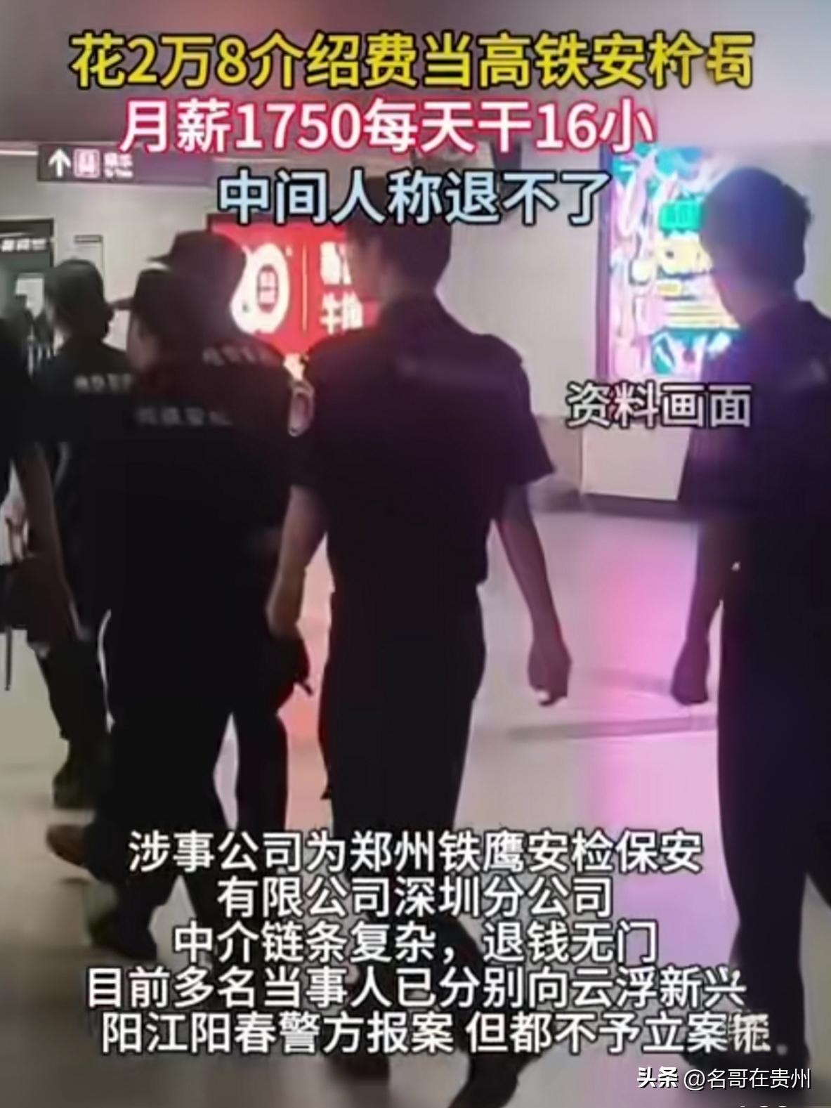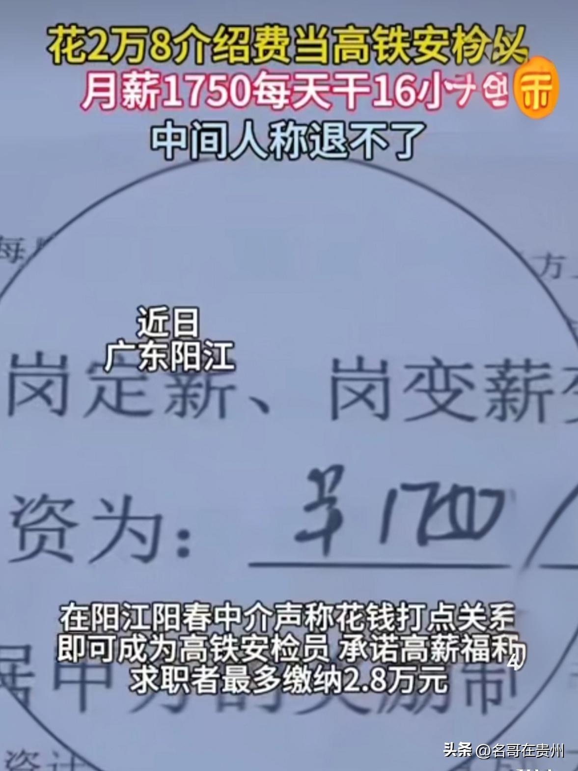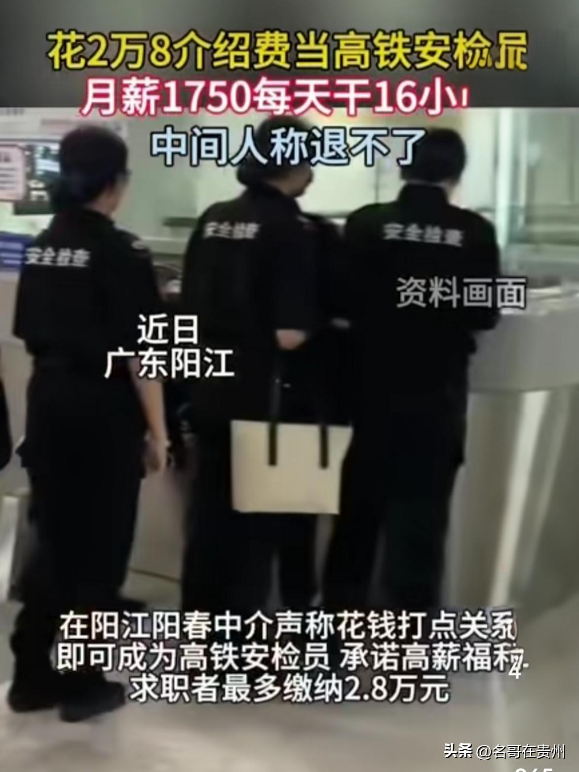 交2.8万进高铁,到手1750!求求你们,别再把血汗钱送给骗子了! 朋友们,今天说个事儿,看完心里真不是滋味,堵得慌。 广东阳江有几个打工的兄弟,本来想着花点钱买个安稳,结果却掉进了“天坑”。他们掏空积蓄,甚至借钱凑了2.8万的中介费,就为了那个中介嘴里“高薪稳定、五险一金”的高铁安检铁饭碗。结果呢?入职一看,月薪1750,每天要干16个小时!你算算这账,时薪连4块钱都不到,连吃碗带肉的面都不够,这哪是去上班,这是花钱去买罪受啊! 咱先说说这骗局是怎么一步步把人套牢的。中介一开始把饼画得那叫一个圆,什么“高铁直招”、“国企编制”、“月薪三四千还有五险一金”,把老实人听得心里直痒痒。然后就是收钱,1万2到2万8不等,还吓唬你说“岗位紧俏,先交钱锁定名额”。等你交了钱,美滋滋去报到,才发现压根不是那么回事儿。所谓的培训就是走个过场,随便填张卷子就让你上岗。说好的福利全是泡影,每天像个机器一样连轴转16个小时,拿到手的工资只有1750块,连当地的最低工资标准都没到。 更让人绝望的是后面的维权路,简直是叫天天不应,叫地地不灵。等你发现不对劲去找中介退钱,人家两手一摊:“我给你安排上岗了,服务完成了,凭什么退钱?”当初签合同的时候,人家根本没把薪资福利写进去,你手里啥证据都没有。想找高铁站讨说法?没用,因为你是劳务派遣,是外包公司的临时工,高铁方根本没责任。再回头找中介,要么是层层转包,要么直接失联。你去报警,人家说这属于劳务纠纷,证据不足难立案,你只能干瞪眼。 说到底,这帮黑中介就是把咱打工人想求安稳、想走捷径的心理拿捏得死死的。很多人觉得,高铁啊,多体面的工作,肯定靠谱。可实际上,正规的高铁安检岗从来都是免费招聘,常年缺人,根本用不着花钱买。他们就是利用你对“铁饭碗”的执念,跟外包公司联手,一个负责收天价介绍费,一个负责往死里压榨,把你当韭菜割。 咱来算笔扎心的账。就算你一个月不吃不喝,那2.8万块钱你得干整整16个月才能回本。每天干16个小时,身体早就被掏空了,到最后赚的那点钱,怕是连看病的零头都不够。这就是典型的“花钱当牛马”,把血汗钱扔进无底洞。 最后,我必须敲碎警钟跟大伙说一句:但凡正规招聘,绝对不会以任何名义收你高额介绍费、押金、培训费! 凡是跟你吹“花钱买岗”、“内部名额”、“保入职”的,全是诈骗!求求大家,找工作时长个心眼,去之前拿天眼查或者企查查搜一搜用人单位的底细,避开那些外包骗局。聊天记录、转账凭证,一定留好了。万一真碰上这事儿,别犹豫,直接打110报警,再打12333人社热线投诉! 如果你身边也有正在找工作的朋友,尤其是那些急着给孩子找工作的父母,赶紧把这篇文章转给他们!别让咱们的血汗钱,再这么不明不白地打了水漂! 对此,你怎么看?你遇到过这种“花钱买工作”的骗局吗?欢迎在评论区留下你的经历,让更多人避坑! 作者申明: 本文内容根据《澎湃新闻》及相关媒体报道的“广东阳江求职骗局”真实事件整理撰写,旨在揭示求职陷阱,帮助读者提高警惕,避免上当受骗。