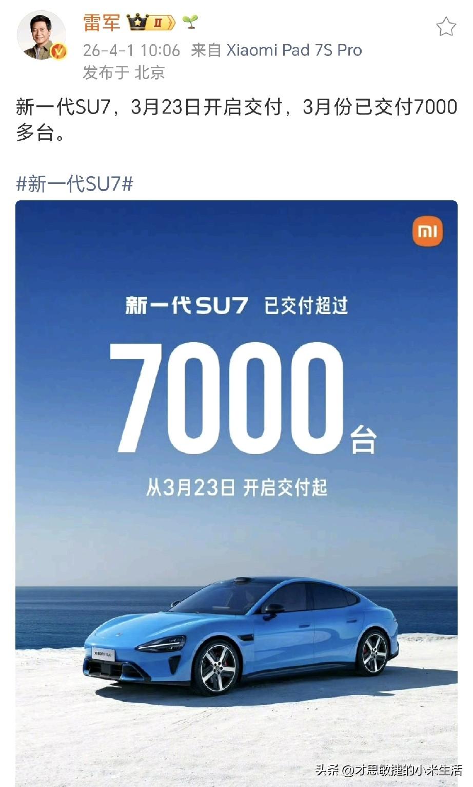 雷军晒小米汽车新一代SU7成绩单:新一代SU7,3月23日开启交付,3月份已交付7000多台。 2026年3月,小米汽车交付量超过20000台! 恐怖如斯啊,新一代SU7 ,9天时间交付了7000台!SU7 初代在2024年四月初首交,三周左右交了 7000 台,新 SU7 一周出头就交了 7000 台,太强了!看到小米汽车又刷新交付纪录,真心为雷总和所有小米同学感到骄傲!这不仅是销量的突破,更是用户对小米技术、品质与创新的认可。 好产品自己会说话,车子好不好,销量数据最有说服力,其实冷静下来思考,新一代SU7,外观设计豪华优雅,小米蛟龙底盘,V6s Plus超级电机,2200MPa小米超强钢,还有激光雷达,防晒隔热玻璃,四门静音夹胶玻璃,三重安全冗余门把手,还有快充,902km长续航,这次换代,直接把短板堵死,想不成功都难。祝贺小米汽车!祝贺雷总!真应了那句话,双手插兜,不知谁是对手。你们觉得呢?