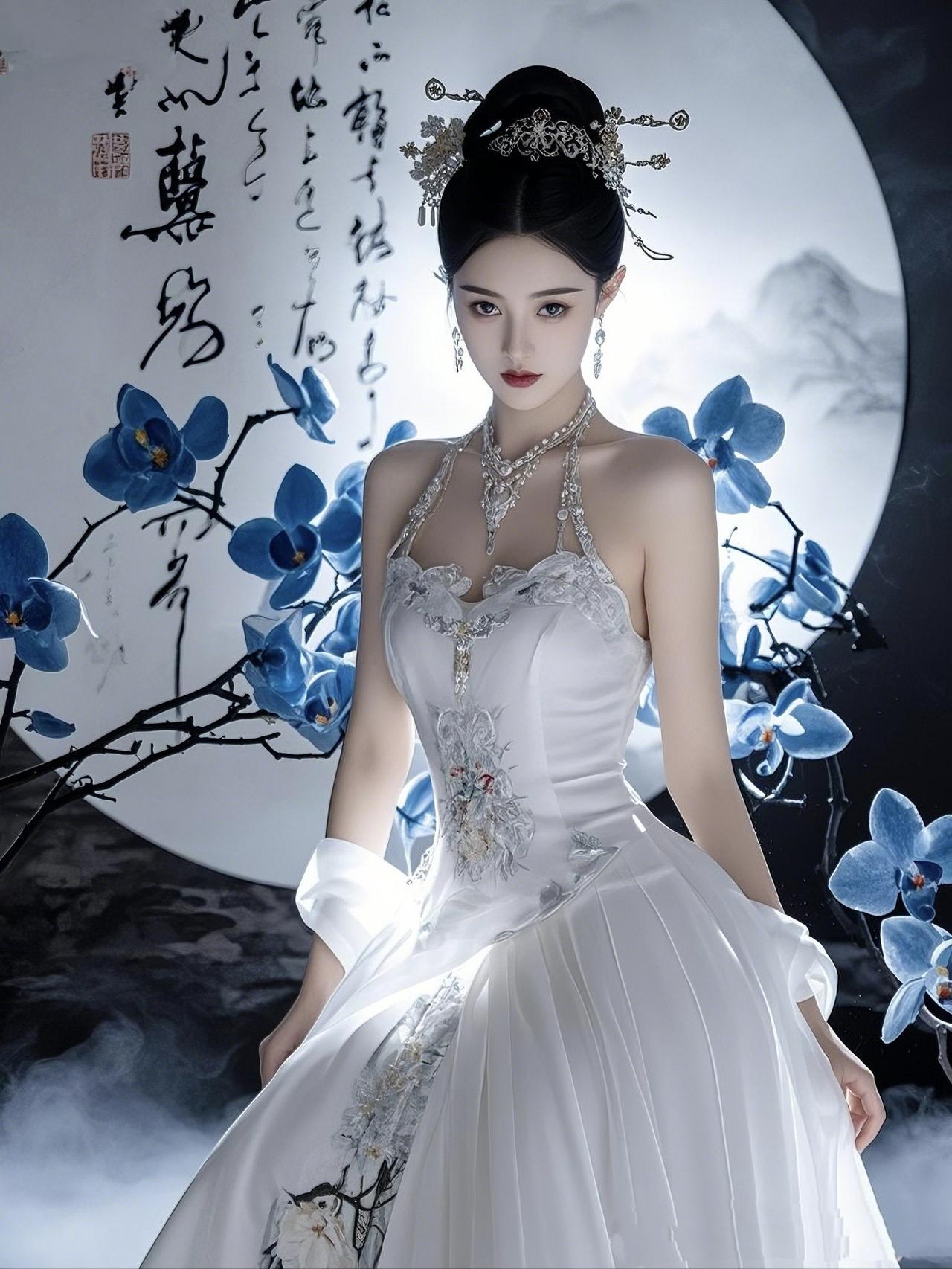 《兰月裁衣,玉骨承风》 银月为盘,墨字为章 兰影斜斜,漫过素白的裙裳 发间银饰,挽住千年的霜 一簪一钗,都缀着东方的月光 肩线裁开云的轮廓 胸间绣满雪的清光 盘扣隐在蕾丝的纹路里 把中式的骨,缝进西式的浪 白裙垂落,如流水漫过青石巷 裙摆上的兰,开在水墨的故乡 颈间银链,绕着月光的凉 耳坠轻摇,碰碎夜的香 眉眼如远山含黛 唇色似朱砂点霜 一抬眼,便撞碎了满庭月光 蓝兰绕身,似蝶栖在枝上 墨痕在月轮上,写尽千年的章 烟岚漫过脚踝,如雾笼潇湘 风拂裙角,抖落一身清芳 她立在兰与月的中央 把东方的雅,穿成流动的画 一颦一笑,皆是山河的温柔 一针一线,都绣着岁月的长 白裙映月,兰香绕梁 一眼,便醉了千年的时光 墨影竹蝶盘扣裙 凤冠华裳 银裳古风照 银裳古风图 华裳鬓影 兰裳古风 兰韵古风 金裳古典照
