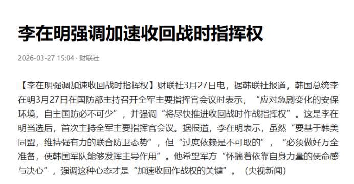 李在明召集高级将领,宣布韩国将从美国手中,收回战时作战指挥权 以牙还牙?李在明亮剑:召集全军将领,宣布收回战时作战指挥权 事件核心(2026.3.27): 李在明在国防部主持首次全军主要指挥官会议(陆海空及联参高层全部出席),当着军方高层正式宣布: "尽快推进收回战时作战指挥权,结束过度依赖美国,实现自主国防!" 一、历史背景:韩国被"夺走"的战争主权 1950年:朝鲜战争爆发,韩军将全部指挥权交给美军。 1978年:韩美联合司令部成立,确立**"平时韩管、战时美主导"**。 1994年:韩国收回平时指挥权,但战时指挥权至今仍在美军(由美军四星上将任司令)。 现状:一旦开战,韩国三军必须完全服从美军命令,连前线调动都需美方批准。 二、李在明为何此时"摊牌"?三大导火索 1. 美军调走萨德,安全信任破裂 美军为填补中东漏洞,单方面撤走驻韩萨德核心装备,韩国防空出现真空。李在明认清:美国优先自身利益,韩国安全靠不住。 2. 以牙还牙,呼应中东反美浪潮 伊朗击美E-3预警机、俄伊联手反击美国,全球"去美化"升温。李在明借势争取军事自主,摆脱"半主权国家"标签。 3. 国内民意与左翼使命 收回战时指挥权是韩国左翼核心政治承诺。李在明要凝聚军方意志,向美国施压。 三、夺权实质:不是口号,是全面布局 时间表提速:原计划2030年,现目标2028年特朗普任期内完成。 能力补短板: 2026国防预算65.8万亿韩元(7年新高),投KF-21、国产反导。 建自主C4I指挥系统,摆脱对美依赖。 年内完成全面作战能力(FOC)验证。 体制重构:组建韩军主导的联合作战司令部。 四、三大阻力:美国+军方+技术 1. 美国死卡不放:战时指挥权是控制韩国的核心杠杆,会设重重门槛。 2. 韩军内部亲美派:大量将领依赖美军体系、装备、训练,抵触自主。 3. 能力差距:情报、指挥、联合作战仍远落后美军。 五、战略意义:东北亚格局大地震 韩国:迈向真正主权国家,国防自主化里程碑。 美韩同盟:从"主从"走向**"平等伙伴"**,美国影响力大减。 半岛:韩朝关系更复杂;中俄乐见韩国去美化。 结语:李在明此举,是对美国**"安全不可靠"的报复,更是韩国争取国家完全主权的宣战。 文人一言:主权不能假手于人,安全不能仰人鼻息。韩国这一"夺权",既是自救,也是时代必然!
