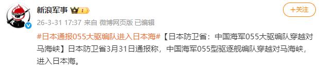 中国海军055万吨大驱编队进入日本海!2026年3月31日,日本方面发布消息,3月30日-31日,由中国海军055万吨大驱、2艘052D型驱逐舰以及903A型综合补给舰,组成的中国海军舰艇编队通过对马海峡进入日本海。 日本方面发布的消息里,还提到了他们的应对动作,和以往一样,日本海上自卫队出动了舰机,对中国海军编队进行了全程监视和情报收集,具体来说,派出了驱逐舰和P-1反潜巡逻机,一路跟踪我们的编队,直到编队进入日本海。 其实这已经是日本的常规操作了,只要中国海军舰艇通过对马海峡,他们都会这样做,一方面是为了收集相关信息,另一方面也是想彰显自己的存在感,但这并不会影响中国海军编队正常执行任务。 很多人不知道的是,这次055编队进入日本海,并不是孤立的行动。根据日本方面的监测,在3月29日,也就是编队通过对马海峡的前一天,中国海军一艘815A型电子侦察船已经先行通过对马海峡进入日本海,相当于提前探路,为后续编队的航行做好准备。 而且在055编队通过之后,还有一艘052D型驱逐舰从另一个方向穿越对马海峡,也进入了日本海,形成了多路联动的态势,这也能看出,中国海军的远海行动越来越体系化、常态化。 再说说这支编队的核心——055型万吨大驱,它是中国海军最先进的驱逐舰之一,战斗力很强,能够承担防空、反导、反舰、反潜等多种任务,有它作为核心,整个编队的作战能力和指挥能力都得到了极大提升。 而两艘052D型驱逐舰作为辅助,能够配合055大驱完成各项训练科目,903A型综合补给舰则负责为整个编队提供物资补给,保证编队能够在远海长时间航行,不用频繁靠岸补给,这也是中国海军能够实现常态化远海训练的重要保障。 可能有人会联系近期的中日关系,觉得这次编队进入日本海,是对日本的威慑。确实,近期日本有一些不友好的动作,比如3月下旬发生了日本自卫队军官侵闯中国驻日大使馆的事件,日本官方不仅没有正式道歉,处理也比较敷衍,而且在3月31日,也就是发布中国编队消息的当天,日本还在本土部署了长射程导弹,明确表示意在加强对中国的威慑力,这些动作都给地区安全带来了不稳定因素。 但中国海军的编队行动,核心目的还是开展远海实战化训练,这是中国海军年度训练计划内的例行安排,不针对任何特定国家和目标。 近年来,中国海军一直在推进常态化远海训练,“海上为家,岸上做客”已经成为海军官兵的常态,很多舰艇常年在远海执行任务,就是为了在大风大浪中磨砺战斗力,提高应对复杂局面的能力。 毕竟,远海大洋才是一流海军大展拳脚的舞台,只有经常走出家门口,才能不断提升实战能力,更好地捍卫国家的海洋权益。 这次055编队进入日本海,也从侧面反映出中国海军的实力已经今非昔比。放在以前,中国海军出远海训练是一件很不容易的事,需要提前做大量准备,担心装备性能、物资补给等问题,而现在,远海航行对中国海军来说,就像“出趟远门”一样寻常,这背后是中国海军装备水平的提升,是指挥体系的完善,也是官兵训练水平的提高。 日本方面之所以对中国海军的行动高度紧张,本质上是因为中国海军的快速发展,打破了他们以往的认知。 但中国海军一直坚持和平发展,奉行防御性的国防政策,我们的远海训练,从来不是为了挑衅谁,而是为了提升自己的能力,更好地维护国家主权、安全和发展利益,同时也为地区和平稳定贡献力量。 就像之前太原舰在远海应对外舰挑衅时表现出的冷静和专业一样,这次055编队进入日本海,全程保持正常航行,严格按照国际法行事,不卑不亢,既展现了中国海军的专业素养,也彰显了我们捍卫海洋权益的决心和底气。 中国海军从来不会主动惹事,但也绝对不怕事,只要是合法合理的行动,我们就会坚定地执行下去,任何国家都无权干涉。 总的来说,这次055万吨大驱编队通过对马海峡进入日本海,就是一次正常的远海实战化训练,符合国际法和国际惯例,也是中国海军常态化远海训练的一个缩影。 它告诉我们,中国海军正在不断成长,正在从近海走向远海,从浅蓝走向深蓝,而这种成长,不仅是为了保护自己,也是为了维护地区的和平与稳定。