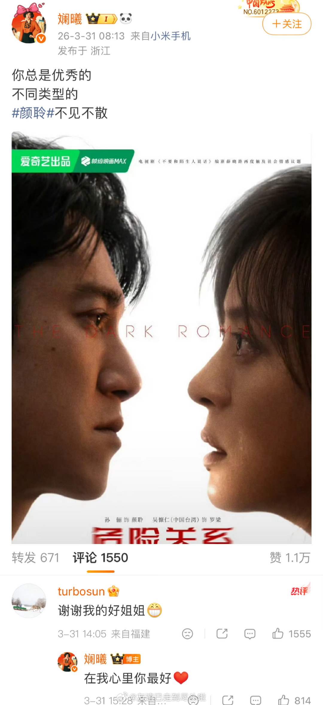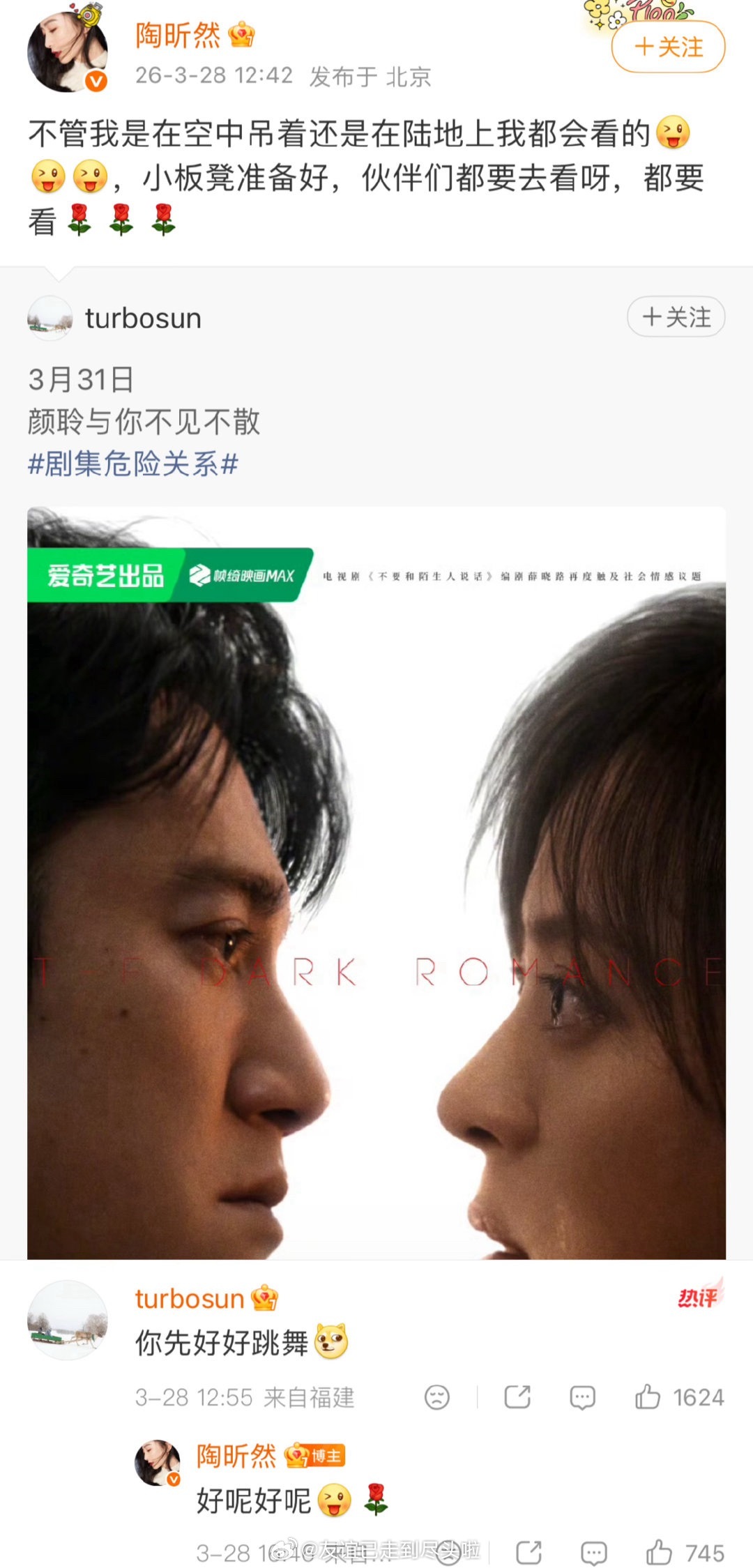 甄嬛传蒋欣、陶昕然、斓曦为孙俪宣传新剧,目前孙俪只回复了安陵容+和沈眉庄,到现在都没回复华妃这有点尴尬了危险关系
