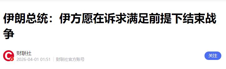 伊朗传来消息 4月1日凌晨,伊朗总统佩泽希齐扬突然放话,说伊朗愿意结束跟美以的战争,但有个硬核条件:对方必须保证不再侵略伊朗! 佩泽希齐扬这话是3月31日说的,在和欧洲理事会主席科斯塔通电话时,表示伊朗愿意结束跟美国、以色列之间的战争,但有一个半点商量余地都没有的硬核条件:美国和以色列必须保证,以后再也不侵略伊朗,再也不对伊朗发动任何侵略性袭击。 可能有人会觉得,伊朗这是打不过了想服软?其实根本不是这么回事,只要看看最近一个多月的局势,就知道伊朗说这话,既有诚意,更有底气,每一句都实打实,没有半点虚的。从2月28日开始,美国和以色列就主动对伊朗发动了军事打击,到3月31日,这场冲突已经持续了32天,伊朗境内的很多地方都遭到了袭击,损失不小。 根据公开的消息,美以联军这段时间没少对伊朗下狠手,不仅空袭了伊朗的核设施、弹药库,还轰炸了伊朗的高校、制药厂和钢铁厂,就连伊朗最大岛屿格什姆岛上的海水淡化厂都被炸瘫痪了,短期内根本修不好,导致当地居民的生活受到了严重影响。 据伊朗红新月会统计,自从冲突爆发以来,伊朗已经有超过10.5万处民用设施受损,这些都是美以侵略行为造成的实实在在的伤害。 面对美以的持续袭击,伊朗也没有坐以待毙,一直在强硬反击。伊朗武装部队多次发射导弹,击中了以色列的集装箱船,还击落了美制的MQ-9“死神”无人机;伊朗伊斯兰革命卫队更是直接把以色列境内的大学、西亚地区的美国大学,以及微软、苹果、谷歌等18家美国信息通信企业列为合法打击目标,甚至警告这些机构的员工尽快撤离,可见伊朗的反击力度一点都不小。 也正是在这样的背景下,佩泽希齐扬才在和科斯塔的通话中说出了那段话,他的原话很明确:“走向局势正常化在于停止侵略性袭击。 我们在任何时候都不会寻求紧张局势和战争,我们有必要的意愿来结束冲突。但是要在遵守相关要求的条件下,尤其是不会再次实施侵略行为的必要保证。” 佩泽希齐扬还特意提到,伊朗曾经带着诚意和建设性的态度,和美国进行过谈判,可没想到,谈判进行到一半,就遭到了美国的非法袭击。 这也让伊朗彻底看清,美国根本不相信外交,只是想通过发号施令,实现自己的贪婪企图,所以这一次,伊朗必须要拿到实打实的保证,绝不能再被美国忽悠。 他还强调,伊朗一直尊重邻国的主权,从来没有想过要攻击邻国,但问题是,美国在很多邻国设有军事基地,并且经常从这些基地出发,对伊朗发动袭击,而这些邻国并没有履行好国际责任,没能阻止自己的领土被用来攻击伊朗,这也是伊朗不得不面对的现实困境。 通话中,欧洲理事会主席科斯塔也表态,当前中东局势已经极其危险,各方必须推动局势降级,为外交努力留出空间,欧盟绝不支持针对伊朗的侵略行为,认为这种行为违反了国际法和国际规则,欧盟也愿意为结束冲突的外交努力提供支持。 值得注意的是,就在佩泽希齐扬放话的同一天,美国方面的表态却十分矛盾。美国国防部长赫格塞思说,美国当前的首要任务是寻求协议,结束和伊朗的战事;白宫新闻秘书也表示,美伊双方的对话一直在持续,而且进展顺利。 但与此同时,美国却在不断向中东增兵,不仅部署了第三艘航母,还派遣了数千名精锐空降兵抵达中东,这些部队都处于可以对伊朗发动打击的范围之内。 以色列方面则表示,美以对伊朗的行动已经过半程,当前的重点还是放在伊朗的浓缩铀储备上,丝毫没有要停止袭击的意思。 这种一边喊着要谈判、要结束战争,一边又持续增兵、继续袭击的做法,也让外界对美以的诚意产生了很大的怀疑。 其实伊朗的想法很简单,也很实在:我不是好战分子,也不想一直打下去,战争对谁都没有好处,只会让更多无辜的人受到伤害,所以我愿意结束冲突。 但我也不能白白受欺负,之前美以的侵略已经给伊朗造成了巨大的损失,要是没有一个明确的保证,万一结束战争后,美以又卷土重来,再次发动侵略,伊朗就会陷入更被动的境地。 伊朗武装部队之前就已经明确表态,会斩断任何侵略伊朗者的腿,将其遗弃在屈辱的黑土之中,还会把美以军事指挥官和政治官员的住所列为合法打击目标,这都足以说明,伊朗有能力捍卫自己的国家主权和领土完整,提出这样的硬核条件,不是示弱,而是对自己国家和人民负责。 这件事也不是简单的“停火提议”,背后其实是中东地区战略博弈的体现。美以一直想通过军事打击压制伊朗,而伊朗则在奋力反抗,捍卫自己的合法权益。佩泽希齐扬的这番话,既是对美以的警告,也是对和平的呼吁——和平可以谈,但前提是必须尊重伊朗的主权,停止一切侵略行为。