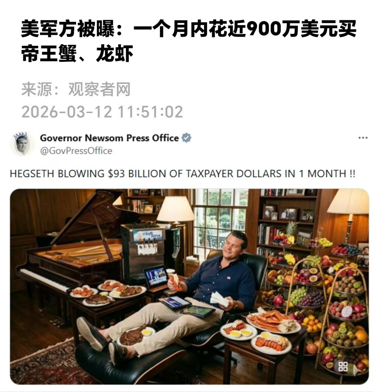 前方吃紧,后方紧吃。 美国加州州长纽森发帖嘲笑赫格塞斯领导下的战争部无节制地挥霍纳税人的金钱。 图片画面显示,赫格塞斯悠闲地躺在沙发上,享受着各种美食和水果,好不快哉! 据爆料,去年9月赫格塞思一个月挥霍930亿美元纳税人资金,用于采购包括家具、苹果设备等奢侈消费品。而且,自特朗普发动对伊战争以来,前5周的军费开支已经高达350亿美元。 如此,瞠目结舌的国防开支,老百姓不游行才怪呢!