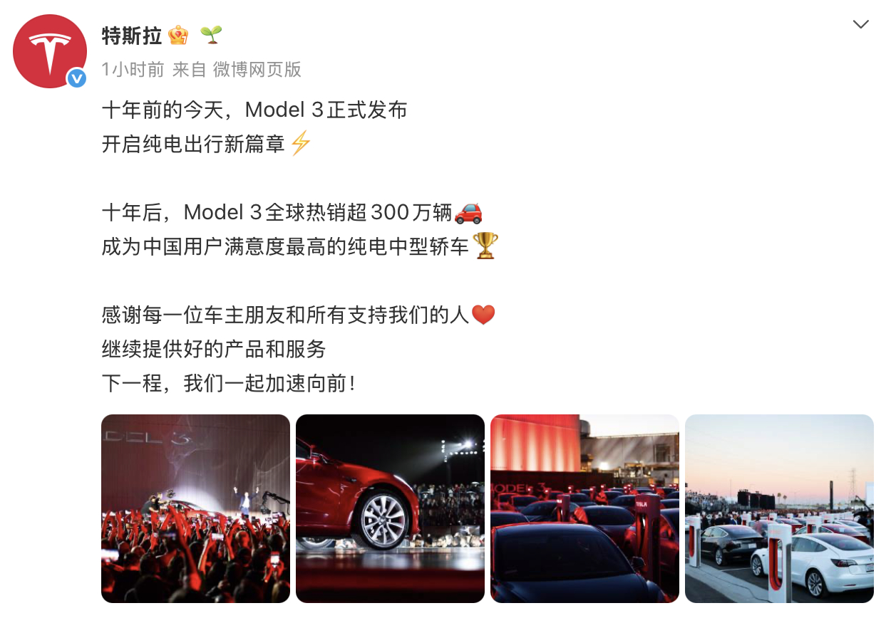 今天是特斯拉Model3发布十周年十年时间,Model3在全球卖了300万辆