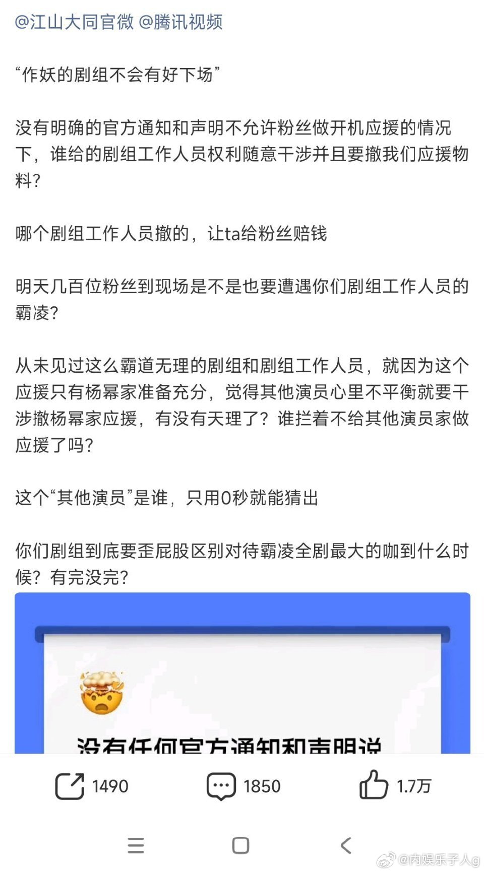 江山大同剧组里到底谁在作妖啊…只是因为杨幂粉丝准备了应援,怕其他演员不平衡,竟然擅自作主撤了幂姐粉丝的心意…?