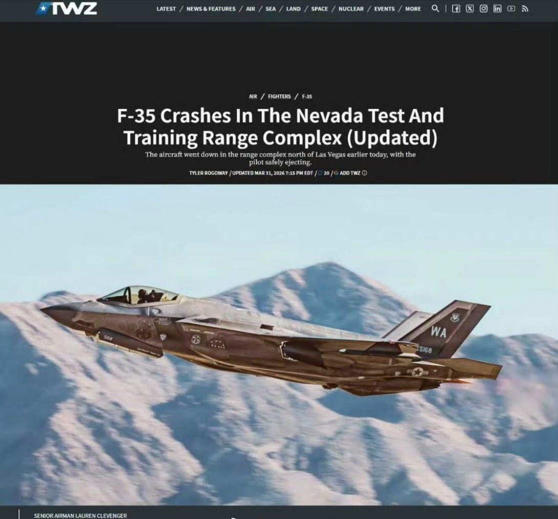 美国“战区”(TWZ)网站报道,当地时间3月31日,一架来自内利斯空军基地,隶属于美国空军第57联队的F-35战斗机在内华达州拉斯维加斯以北的一个军事试验场坠毁。飞行员成功弹射逃生,只受了轻伤,现已成功获救。