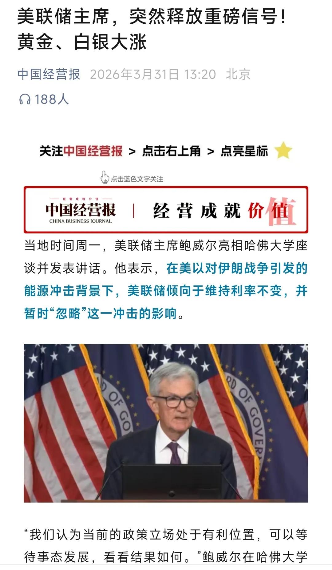 多数人都被机构带偏了。鲍威尔3月30日哈佛讲话的原文核心+潜台词一次性说透👇 一、原文核心意思(3月30日哈佛讲话) - 当前立场:暂不加息、暂不降息、维持观望 - “我们当前政策处于有利位置,可以等待事态发展” - 对油价/能源冲击:暂时忽略、不立即反应 - 理由:能源冲击通常短暂,货币政策滞后,现在动会错配 - 没说“一定不加息”:只说现在不考虑,保留加息权利 - 关键红线:通胀预期 - 原话:“如果物价上涨改变公众对通胀的长期预期,美联储将不得不采取行动(=加息)” - 强调:经历多年高通胀后,不能掉以轻心 二、长期利空因素未解除 ✅ - 他没承诺不加息,只是现在不考虑 - 他明确说暂时不考虑油价因素(短期冲击) - 潜台词就是:如果油价→通胀→预期失控,就会加息 三、一句话总结(最关键) 短期:油价涨→不加息;中期:油价涨→通胀预期失控→加息 四、对白银的直接影响 - 短期(1–3个月):不加息+暂不理油价 → 银价止跌、小幅反弹 - 中期(6–12个月): - 若油价持续→通胀预期稳住→不降息、不加息 → 银价震荡磨底(63–70美元) - 若油价→通胀预期失控→重启加息 → 银价再下探(58–63美元) 今晚小非农,就看数据了,超预期的话,又是一日行情美联储利率决定