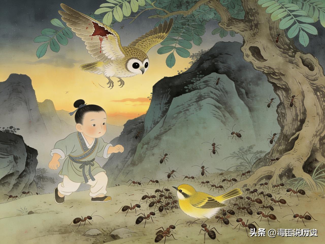 汉朝年间,华阴杨家出了一件怪事。这家人世代清贫,既无显赫的家世,也无过人的财富,可偏偏从杨宝这一代开始,子子孙孙接连有人官至太尉,一门四世三公,权倾朝野。更奇的是,这家人个个清白正直,从不贪赃枉法,在乱世之中竟能全身而退,满门荣耀。 有人说是祖坟冒了青烟,有人说是祖上积了阴德。可杨家的子孙们心里都清楚——这一切,都源于杨宝九岁那年,在华阴山北遇到的一只黄雀。 那年秋天,杨宝独自在山中玩耍。傍晚时分,天色渐暗,他正要下山,忽然听见一声凄厉的鸟鸣。循声望去,只见一只黄雀从空中坠落,重重地摔在一棵老槐树下。 杨宝跑过去一看,黄雀的翅膀被一只鸱鸮撕开了一道口子,鲜血直流。更可怕的是,地上的蚂蚁闻到血腥味,密密麻麻地爬了上来,转眼间就将黄雀团团围住。那黄雀拼命挣扎,却怎么也站不起来,一双黑豆似的眼睛望着杨宝,满是绝望。 杨宝心里一紧,二话不说,脱下外衣将黄雀裹了起来,小心翼翼地拂去蚂蚁,捧在手里带回了家。 此后数月,杨宝每日采黄花喂它,给它换药,用细布包扎伤口。那黄雀也通人性,伤好之后并不急着飞走,常常落在杨宝肩头,叽叽喳喳地叫,像是在道谢。 一百多天后的一个清晨,黄雀忽然展翅高飞,在杨宝头顶盘旋了三圈,长鸣一声,消失在天际。 杨宝望着它远去,心里空落落的,却也没太当回事。他不过是个九岁的孩子,救一只鸟,纯粹是于心不忍,哪里想过什么回报? 可那天夜里,怪事发生了。 夜深人静,杨宝迷迷糊糊刚要入睡,忽然听见屋外传来一阵轻响。紧接着,房门无风自开,一道金光透了进来。杨宝揉揉眼睛,只见一个身着黄衣的少年童子站在床前,面如冠玉,周身隐隐笼罩着一层淡淡的光晕。 杨宝吓了一跳,正要喊人,那童子却深深一揖,开口说话了:“恩公莫怕。” 他的声音清脆如玉石相击,带着一种不属于人间的空灵感:“我是西王母座下的使者,奉命前往蓬莱传信,不料途中遭遇鸱鸮袭击,坠落凡间,险些命丧蚁口。若非恩公慈悲为怀,出手相救,我早已化作枯骨。此恩此德,无以为报。” 杨宝这才明白过来——自己救的那只黄雀,竟是天上来的使者。 他呆呆地看着那童子,半晌说不出话。童子微微一笑,从袖中取出四枚晶莹剔透的白环,递到杨宝手中。那白环温润如玉,却又透着一种说不出的奇异光泽,拿在手里,竟隐隐有种暖意。 童子郑重说道:“这四枚白环,赠予恩公。此环非比寻常,可保恩公子孙四代,洁白无瑕,位极人臣。” 说完,他再次深深一揖,转身化作一道金光,消失在夜色之中。 杨宝攥着那四枚白环,愣在原地,许久才回过神来。他将白环小心翼翼地收好,心里却半信半疑——一只黄雀报恩,就能保佑子孙四代?这也太玄了。 可后来的事,由不得他不信。 杨宝的儿子杨震,自幼聪慧过人,博览群书,人称“关西孔子”。他为官清廉,深夜有人送金,说“暮夜无知者”,杨震却正色道:“天知、神知、我知、子知,何谓无知?”从此“四知”拒金的故事传遍天下,官至太尉。 杨震的儿子杨秉、孙子杨赐、曾孙杨彪,个个清正廉明,无一例外都做到了太尉。一门四代,三公之位,代代清白,这在尔虞我诈的汉末乱世,简直是不可思议的事。 后来有人翻开杨家的族谱,算了又算,发现了一个惊人的巧合——从杨宝到杨彪,不多不少,正好四代。而杨彪之后,杨家虽然仍有子弟入仕,却再无一人能做到三公之位。 那四枚白环的福泽,到第四代头上,恰恰好,用完了。 杨宝当年救下的不过是一只黄雀,谁能想到,这只黄雀竟带来了四代人的福泽。可细想起来,那四枚白环真的只是巧合吗? 或许,真正保佑杨家的,从来就不是什么白环。而是杨宝九岁那年,面对一只垂死的黄雀时,心里生出那一丝不忍。那丝不忍,种在了杨家子孙的血脉里,才有了杨震的“四知”,才有了四代人的清白与正直。 白环只是一个记号。真正的风水,是人心里的那点善念。它悄无声息地种下去,然后在你想不到的时候,长出满树繁花。 (根据唐李贤为《后汉书·杨震传》注改写。)杨震