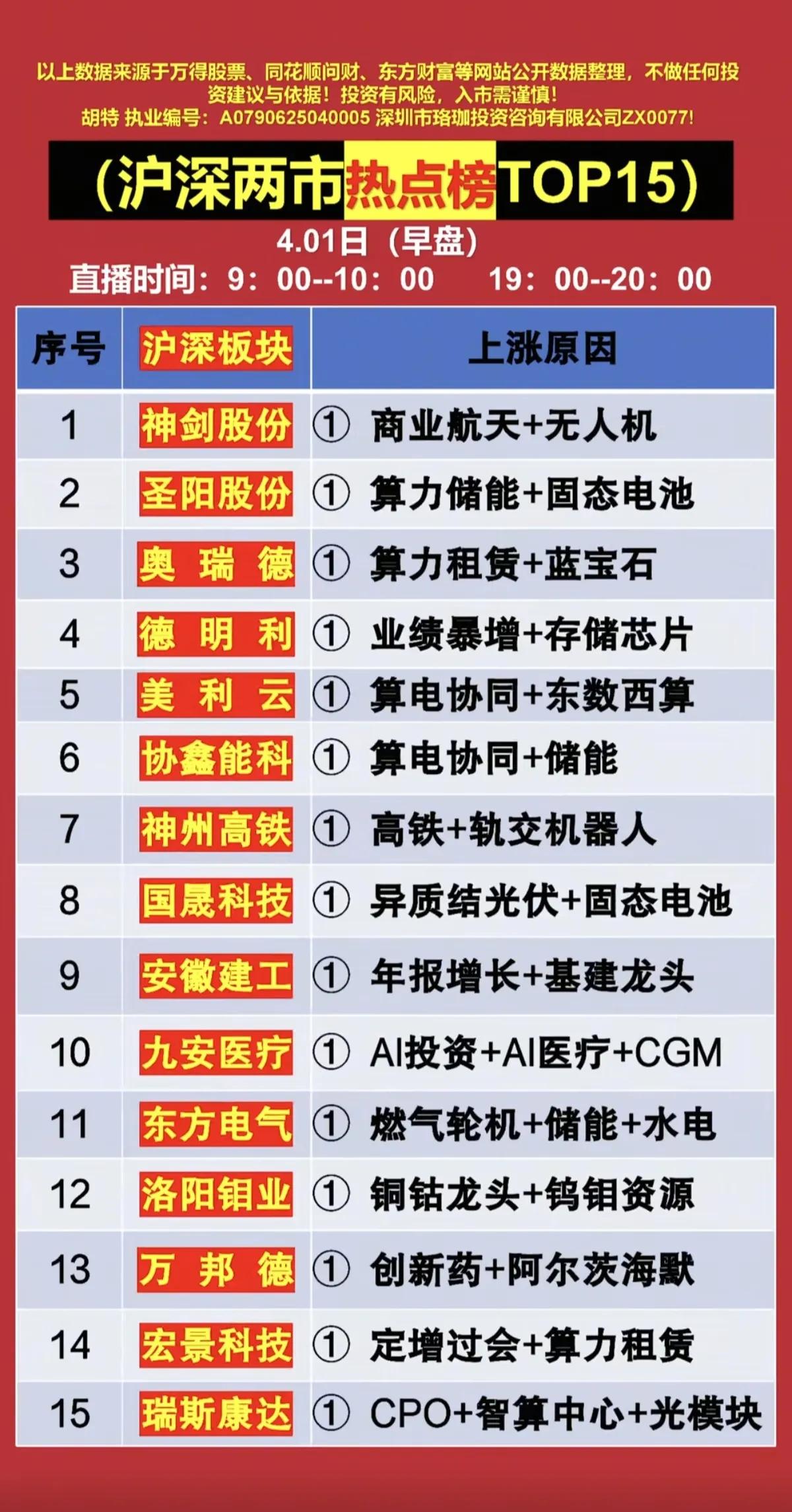 4.1早盘行情速递:AI算力霸榜,资金大挪移! 早盘A股的主线已经明牌,AI算力彻底引爆市场,资金上演疯狂大挪移! 先看热点榜TOP15,算力、储能、AI医疗几乎承包了半壁江山。奥瑞德、美利云、协鑫能科、宏景科技、瑞斯康达全是算力相关标的,叠加算力租赁、算电协同、CPO等热门概念,妥妥的市场主线。圣阳股份、国晟科技绑定固态电池+储能,九安医疗、万邦德则扛起AI医疗大旗,赛道轮动清晰。 再看资金流向,更是直接暴露了资金的真实态度! ✅ 资金疯狂抢筹:寒武纪直接狂揽19.02亿净流入,算力龙头彻底封神;招商轮船、东方电气、协鑫能科也被资金爆买,AI+电力+航运多点开花。 ❌ 资金疯狂出逃:阳光电源遭27.15亿资金砸盘,比亚迪、工业富联等前期热门标的集体躺枪,资金从高位赛道撤离的信号十分明显。 早盘行情已经给足了方向,AI算力、AI医疗、储能仍是资金主攻的主阵地,新能源赛道则持续承压。接下来就看主线能否持续放量,大家紧跟资金动向,别站错队! 友友们怎么看!!!