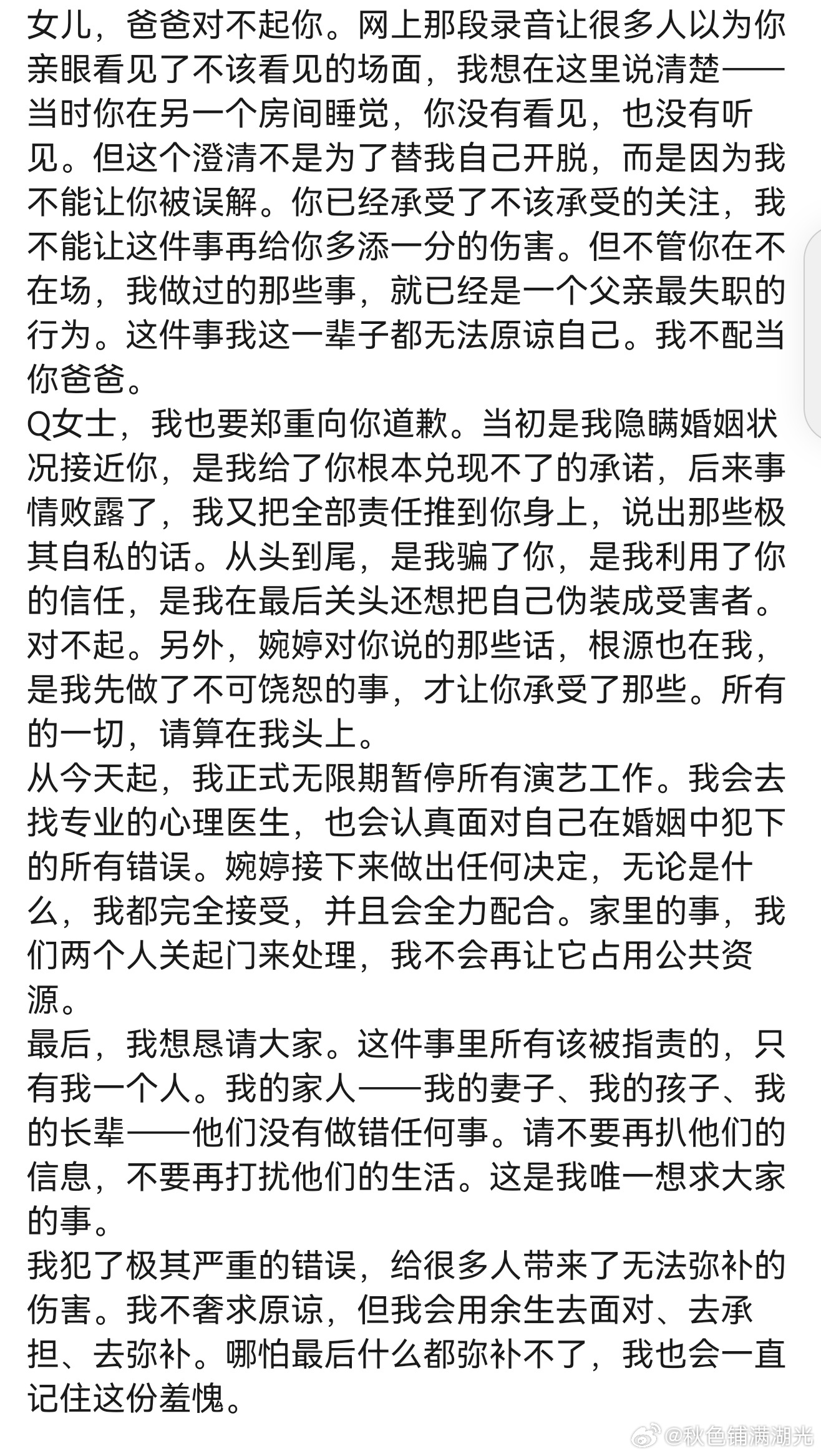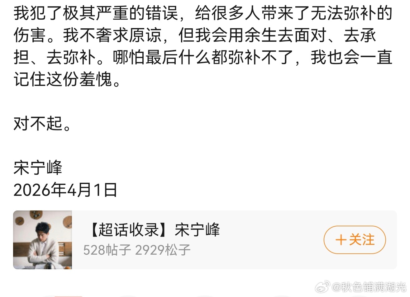 宋宁峰为出轨道歉宋宁峰就出轨道歉 宋宁峰承认出轨,并就此事向张婉婷、女儿以及Q女士道歉。宋宁峰宣布无限期暂停演艺工作,恳请大家不要去打扰他的妻子、女儿、长辈,这件事只有他一个人应该被指责。