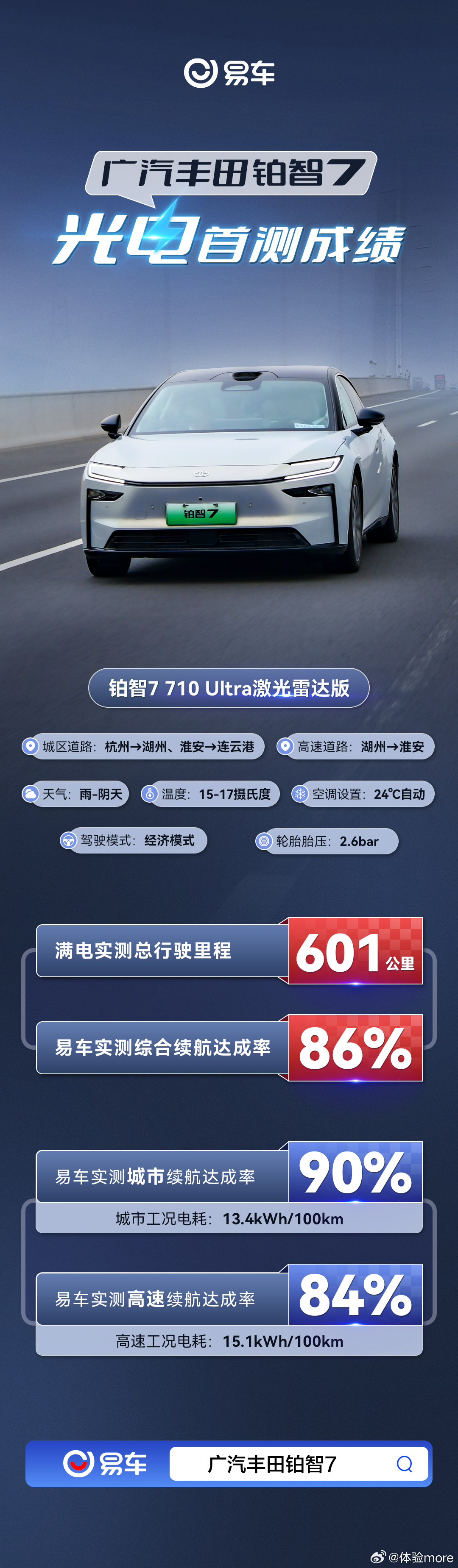 铂智7刚上市,易车就拉来测续航了,看了下是从杭州到连云港,有国道也有高速,而且是三人+设备+全程开空调,这非常符合家庭出行用车场景了,综合实测续航里程601公里,实测综合续航达成率86%,非常够用了。