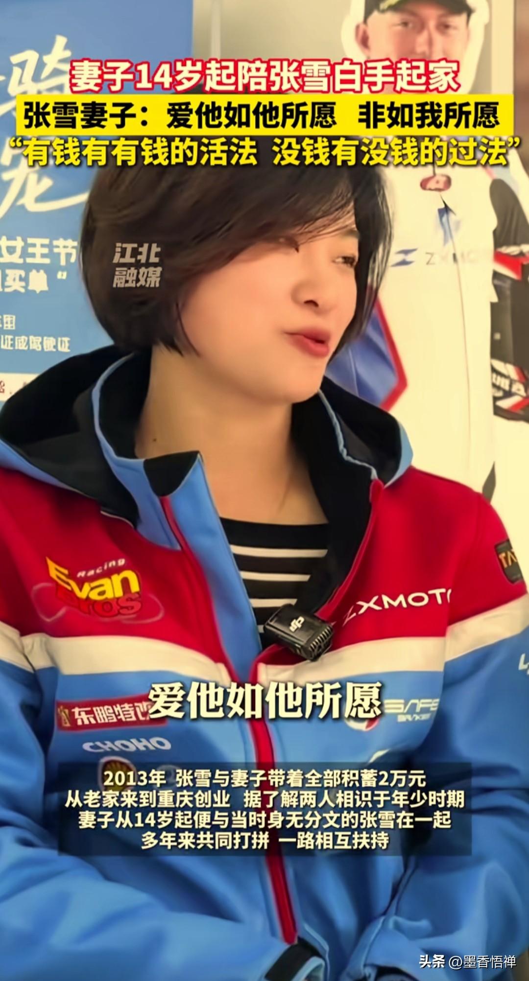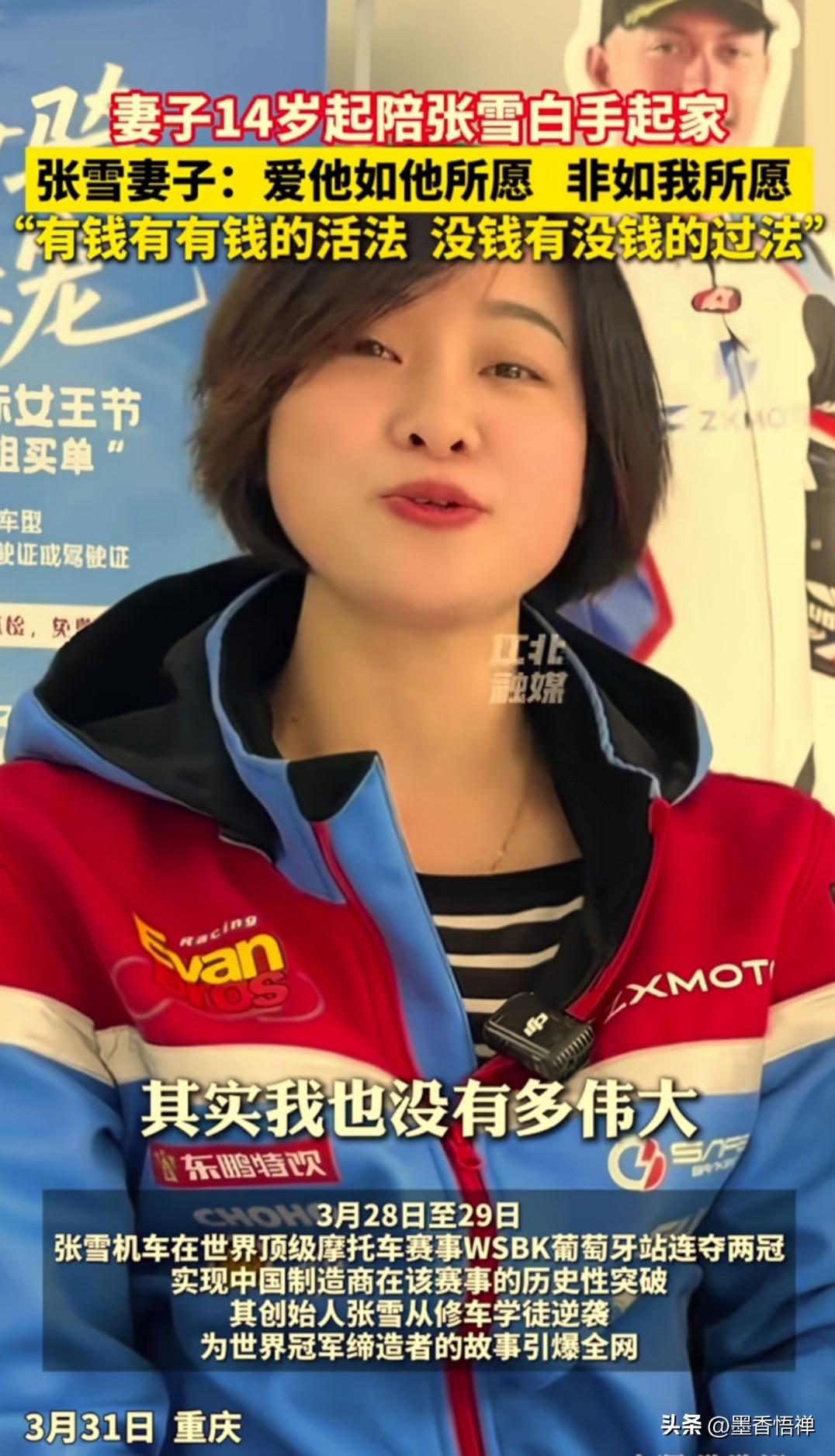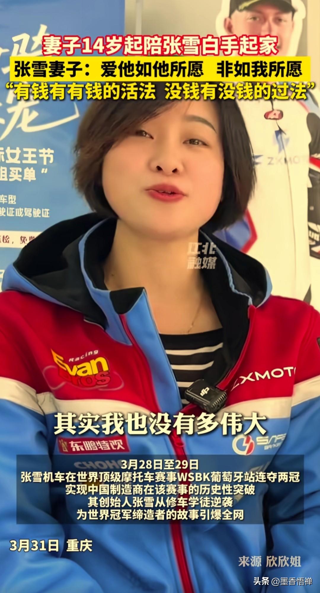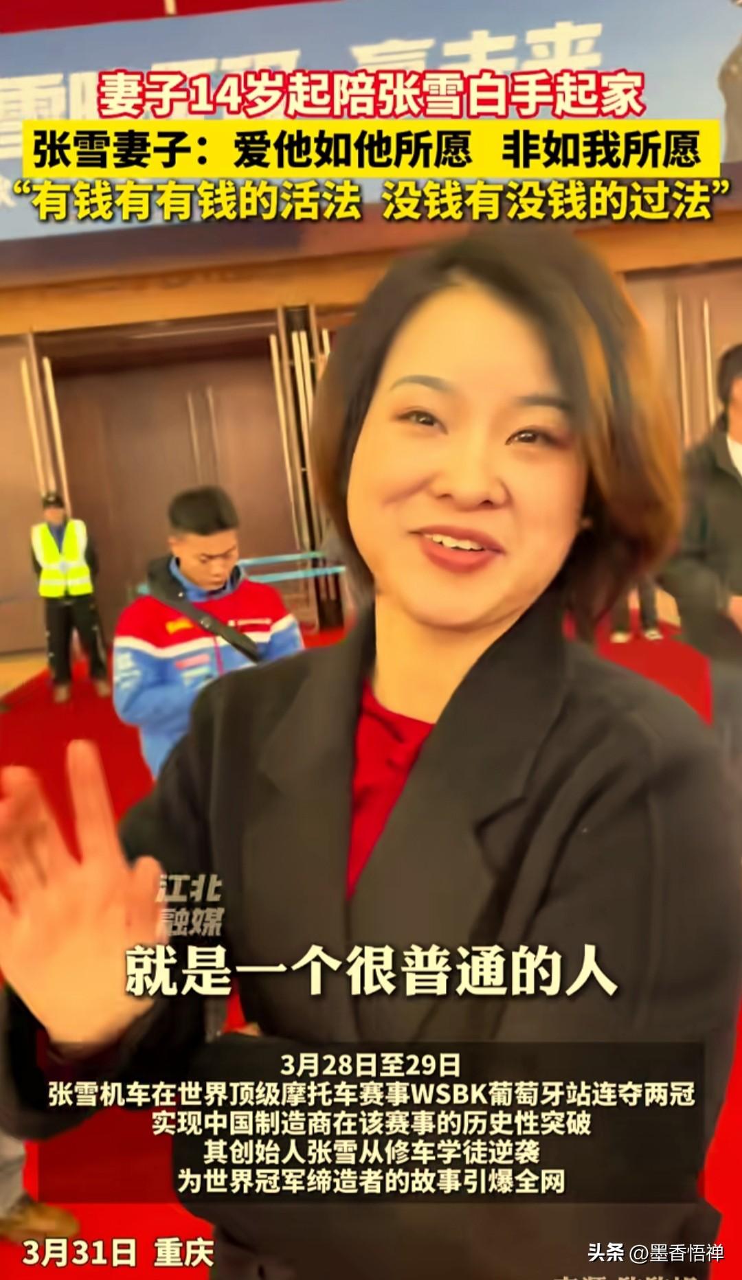 真是贤妻扶我青云志!十几岁陪张雪白手起家,这才是逆袭背后最动人的底气 张雪能从修车学徒逆袭成世界冠军,最该感谢的,就是那个从十几岁就陪在他身边的女人。 他们从14岁相识,到2013年揣着全部积蓄2万块闯重庆创业,她陪着身无分文的张雪,一路摸爬滚打,从一无所有到WSBK双冠王。 有人问她,这么多年跟着张雪吃苦,后悔吗? 她笑着说:“其实我也没有多伟大,就是一个很普通的人。我是一个喜欢写日记的人,我喜欢记录我的生活。我以前写过这句话:爱他如他所愿,非如我所愿。有钱有有钱的活法,没钱有没钱的过法,就这么简单。过日子,要放平心态,有口饭吃就行。” 她没有抱怨,没有索取,只有无条件的支持和陪伴。张雪去拼世界赛场,她就做他最坚实的后盾;张雪要给家乡红糖带货,她就默默打理好后方;张雪被质疑、被不看好,她始终坚定地站在他身边。 世人都夸张雪的逆袭有多燃,却少有人看见,这份逆袭背后,是一个女人用十几年青春,撑起的一片天。 贤妻扶我青云志,我还贤妻万两金。 张雪的冠军奖杯里,有一半,是属于这个陪他白手起家的女人的。 有一网友说:她说的翻译过来就是,你想找一个将军,就得在他还是小兵的时候选择跟他,她才是张雪的天使投资人啊! 这才是最动人的爱情,这才是逆袭故事里,最温暖的底色!