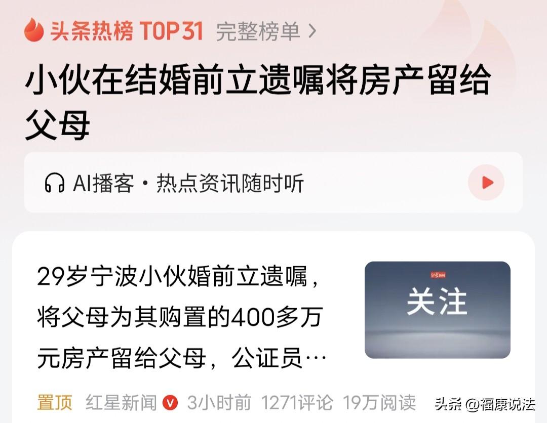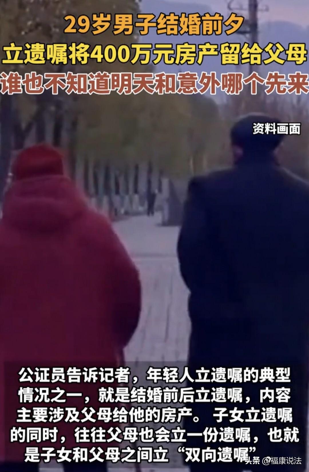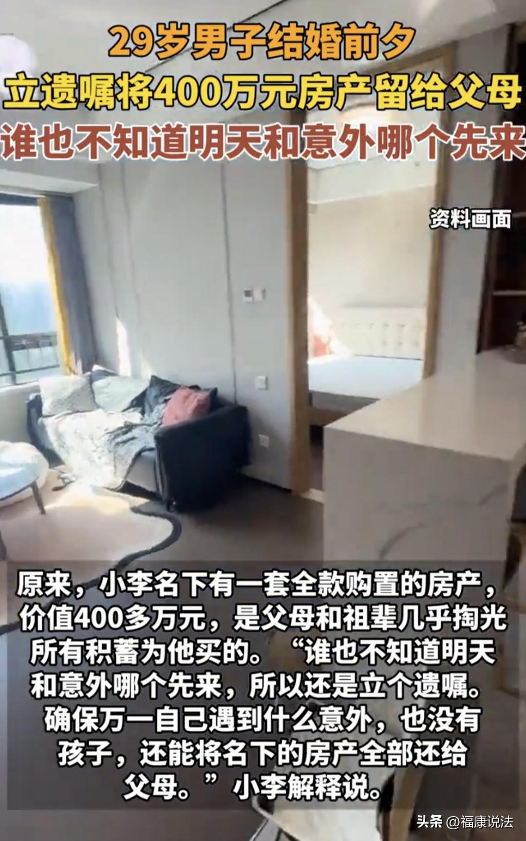 浙江宁波,29岁男子婚期将近,他特意在结婚前立下遗嘱,将名下一套400多万的房子全部留给父母,网友:也该先告诉一下未婚妻吧?而男子的理由让人唏嘘。 据红星新闻4月1日报道,29岁的小李老大不小了,婚期定在了2026年5月份,眼看婚期将近,可他先立上遗嘱了。 据了解,小李名下有一套房产,而且是全款买的,有400多万呢。 小李说,这房子是他的父母还有爷爷奶奶省吃俭用把攒的钱都拿出来买的给他的。 所以,小李觉得在婚前得把房子这事弄明白,毕竟自己还没结婚,更没孩子,以后也不能保证自己有个什么三长两短的,不怕一万就怕万一。 万一自己婚后有个三长两短的,这房子成为遗产了,就会出现遗产继承问题,到时候,就说不清了,再起争执犯不上。 因此,他想提前立下遗嘱,把名下的房子全部留给父母。 他的理由是父母和祖辈出了钱,把家里积蓄几乎都拿出来给自己买房,如果万一自己出事,这房就留给父母。 这事一出,网友们有的站女方,觉得小李应该先告诉未婚妻,不然对对方不公平。 男方立遗嘱这无可厚非,但是也应该在婚前把这些告知未婚妻,因为相互信任是非常重要的,不然会有心结的。 不管婚前还是婚后的遗嘱,必须向配偶公开,不能说婚前秘密立了遗嘱,结了婚也不给配偶说。 互相尊重吧,毕竟要过一辈子的人,大大方方的告知对方是对对方的一种尊重,这种情况正常人都能理解吧,不理解的,那么,就应该慎重考虑进入婚姻。 不过,还有一部分人站男方,认为男方的婚前财产,他有权自己处理,不必告诉女方。 现在还没结婚,这只属于男方的家事,男方把彩礼等该给的给了就行,这部分是跟女方有关。剩下婚后小两口一起打拼,婚后财产处理,当然需要告知双方。 提前立遗嘱挺好的,双向保障,如果女方婚前全款买了一套房子,突然去世,肯定也不想分给男方,毕竟是女方自己的财产。 而男方的房子都是上一代或几代家长凑的,属于男方婚前财产,人家自己可以处置。但咱婚内财产可以以女性付出多多争取,那是应的,不过,男方婚前财产咱就别惦记了。 那么,从法律方面怎么看这件事呢? 很多人误以为“婚前财产”在任何时候都只属于自己。 但在法律上,一旦人发生意外且没留遗嘱,这套房子就会作为遗产,由配偶、父母和子女平分。 《民法典》第1127条:遗产继承的第一顺序为配偶、子女、父母。 这意味着,如果小李婚后出意外,他的新婚妻子将与他的父母共同继承这套父母出资的房产。 小李立遗嘱是为了在法律层面给父母留下保障,确保这套凝聚了祖孙三代心血的房子,在极端情况下能完整地物归原主,也就是返还给父母。 为什么父母立遗嘱时必须明确只给孩子一人所有,否则就会变成小夫妻共有呢? 《民法典》第1062条:夫妻在婚姻关系存续期间继承或受赠的财产,为夫妻共同财产,但遗嘱或赠与合同中确定只归一方的财产除外。 如果父母没立遗嘱,等他们百年之后,留下的遗产,尤其是房产,独生子女继承的房子在法律上默认是夫妻共有的,也就是儿媳或女婿自动拥有一半份额。 如果,小夫妻未来婚姻破裂,这套房子是要被平分的。 父母在遗嘱里加上,此房产只归我孩子个人所有这几个字,遗产就完全归自己的子女单独所有,精准拦截了子女配偶的继承权,确保家产只留在自家血脉手中。 那么,小李有必要将立遗嘱的事情告知未婚妻吗? 立遗嘱属于高度私密的财产处分行为,法律并未强制要求提前告知他人。 如果,小李选择不告知未婚妻,在法律和道德上均无可指摘,这属于个人财产规划的自由。 但从维护婚恋信任的角度看,提前坦诚沟通可以避免未来的误解。 因为一旦未婚妻在婚后得知遗嘱内容,可能会对小李产生不信任感,甚至怀疑小李对婚姻的诚意。 假如,小李选择保密,也是合理的自我保护,毕竟预案的生效条件是发生极端不幸事件,提前告知反而可能增添不必要的焦虑。 你对此有什么看法呢?