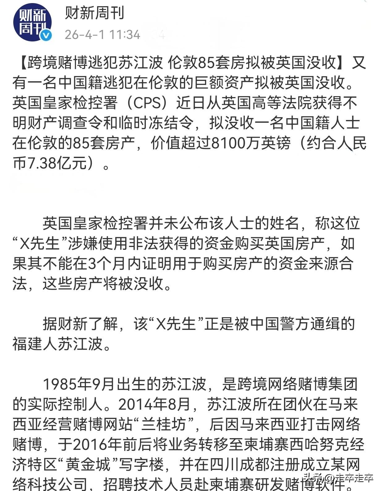 英国冻结一名中国公民在伦敦的85套房产,总价值超过8100万英镑(约合人民币7.38亿元)当事人尚未被刑事定罪。 该名男子被指为跨境网络赌博集团实际控制人苏江波,福建籍,85年出生。14年8月苏江波所在团伙在马来西亚经营赌博网站“兰桂坊”,后因马来西亚打击网络赌博,于16年前后将业务转移至柬埔寨西哈努克经济特区“黄金城”写字楼,并在四川成都注册成立某网络科技公司,招聘技术人员赴柬埔寨研发赌博软件。 苏江波此前通过加勒比海国家圣基茨和尼维斯提供的投资入籍项目(俗称“黄金护照”),在英国注册公司,并自23年9月起在伦敦大举购入房产。其中,一套位于伦敦市中心的顶层公寓价值高达1300万美元。就在其集中购房不久后,福建省大田县人民法院于23年9月15日发布通缉令,将包括苏江波在内的38名嫌疑人列为“在逃犯罪嫌疑人”,涉及非法赌博、诈骗及网络犯罪等多项指控,并公布了相关照片及住址信息。 英国皇家检控署(CPS)援引《2002年犯罪收益法》,向高等法院申请“不明财富来源令”(UWO)和“临时冻结令”,苏江波需在3个月内证明购房资金合法来源,否则房产将被没收。 本案是继25年新加坡洗钱案逃犯苏炳海在英资产被没收(约2.6亿人民币)后,英国再次针对中国籍经济逃犯的重大行动。皇家检察署表示,过去五年已通过没收令追回4.78亿英镑(约合人民币44亿元),其中9500万英镑(约合人民币8.8亿元)已返还受害者。