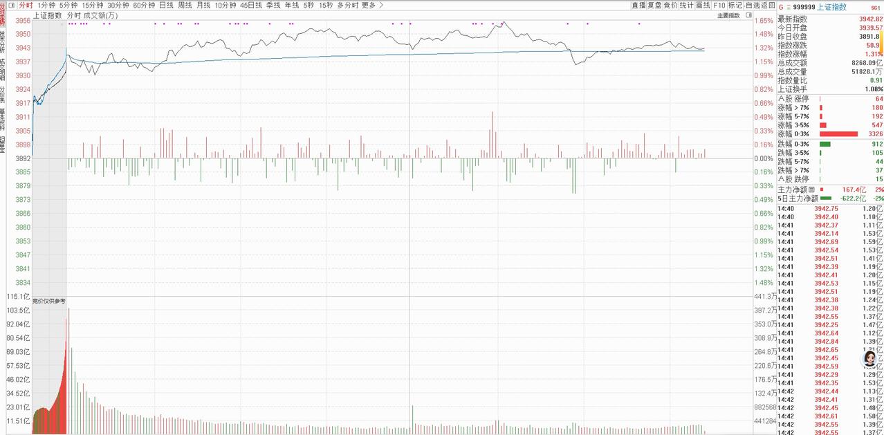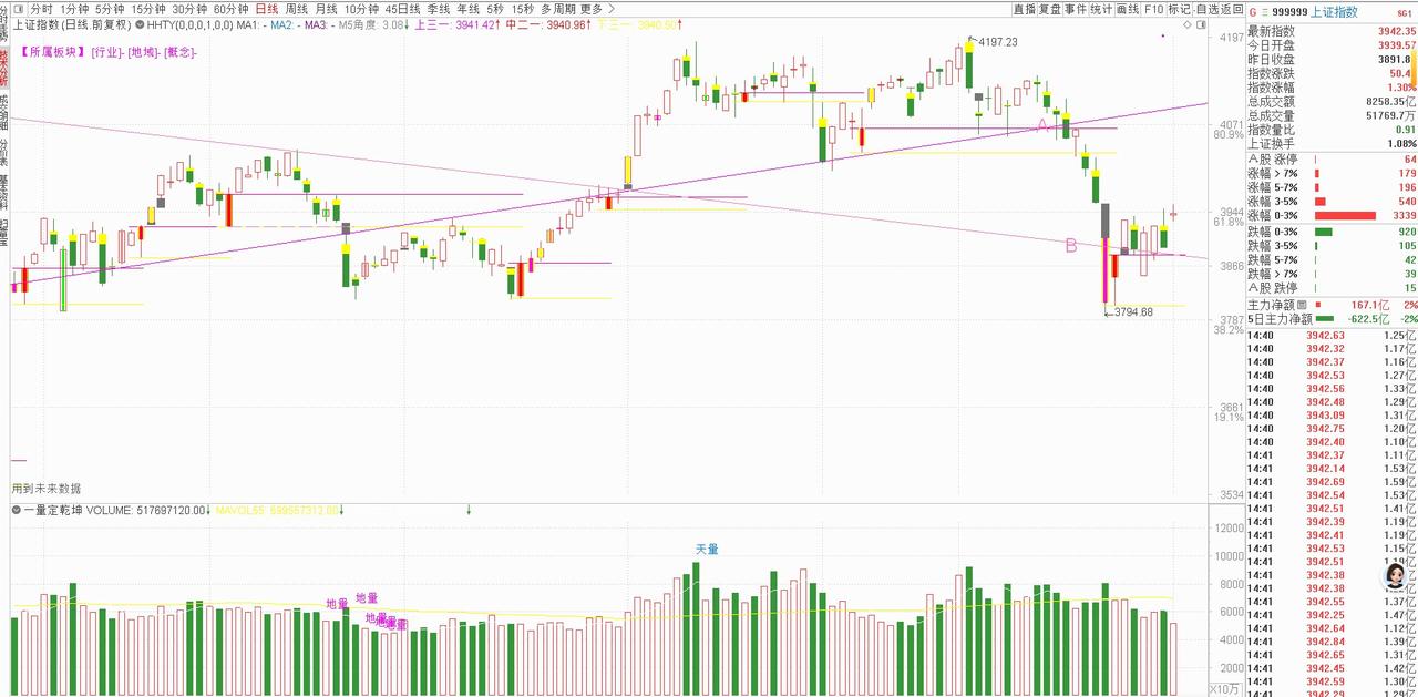 明天(2026年04月02日)星期五的大盘走势: 盘面回顾:震荡加剧下的量能异动 今日大盘跳空高开于3939点,09:30下穿人线,09:35上碰人线不过,13:55下穿人线,14:05上碰人线不过,14:10上穿人线,直至收盘大盘分时不健康。全天围绕人线反复纠缠,多次上穿、下穿却始终未能形成有效突破,分时走势尽显疲态。从早盘09:30首次下穿人线开始,盘面便陷入了“上攻遇阻-回落试探-再攻失败”的循环,直至尾盘仍未摆脱震荡格局,最终以不健康的分时形态收盘。 这一走势恰好印证了昨日的判断:“大盘这两天的震荡幅度加大”。值得注意的是,尽管指数在太极线B上方运行,整体风险可控,昨天大盘处于“10日内最低量柱范围”,今天放量这一动作正契合量学中“低量加倍量”的看涨逻辑:当市场进入惜售的低量状态后,突然出现的放量往往意味着主力资金的介入,为后续行情埋下伏笔。 明日展望:三线划定区间,倍量成关键信号 对于明日(4月2日)的大盘走势,可通过盘前三线清晰划定运行区间:上线3980点为压力位,中线3942点为多空分水线,下线3932点则是短期支撑位。若指数能站稳中线并向发起冲击,且成交量同步放大形成倍量阳柱,那么量学口诀“百日低量处倍量就涨停”的效应有望显现,大盘或迎来突破性行情。反之,若指数跌破下线且量能持续萎靡,震荡格局可能进一步延续。 板块选择上,需牢记“震荡期间别做短线”的警示。当前量化交易对市场的影响愈发显著,AI算法能瞬间整合上万因子捕捉短线机会,普通投资者在短线博弈中很难占据优势。与其在震荡中追涨杀跌,不如耐心等待量能信号明确后,布局基本面扎实、契合市场主线的板块。 操作策略:以静制动,等待明确信号 在当前震荡加剧的市场环境中,最稳妥的策略是以静制动。投资者应密切关注明日成交量的变化,尤其是倍量阳柱是否出现,这将是判断行情能否启动的核心信号。同时,严格按照盘前三线设定止损止盈位:指数站稳中线可适当加仓,跌破下线则及时减仓规避风险。