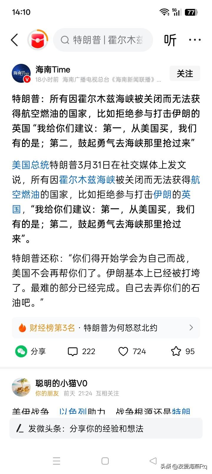 推的干干净净? 特朗普就是特朗普,完全不用管他与以前美国的总统作为和行事是否一样。 全世界估计没有任何人不知道,是因为美国和以色列对伊朗持续到现在,仍然在进行的空中打击的战争,才造成伊朗不顾一切的袭击商船和油轮,关闭了霍尔木兹海峡。 但是,战争的始作俑者,美国总统特朗普说:所有因关闭霍尔木兹海峡而无法获得航空燃油的国家,比如拒绝参加打击伊朗的英国,特朗普给出的建议就是,第一从美国购买航空燃油,因为美国有的是。第二就是去海峡那边打伊朗,将油抢过来。 特朗普还声称,你们必须要学会为自己去战,而不是美国帮助你们而战,因为美囯以后不会再为你们而战。 听起来,特朗普说的似乎理直气壮,言之凿凿,但他好像忘记了霍尔木兹海峡被关闭的直接、或唯一的原因,就是美国和以色列持续至今对伊朗的侵略而造成的。这就像一个人捅了马蜂窝,怒气冲冲的马蜂无处发泄,就蜇了很多无关的人,但捅马蜂窝的人却袖手旁观,甚至是这在一旁说凉话。