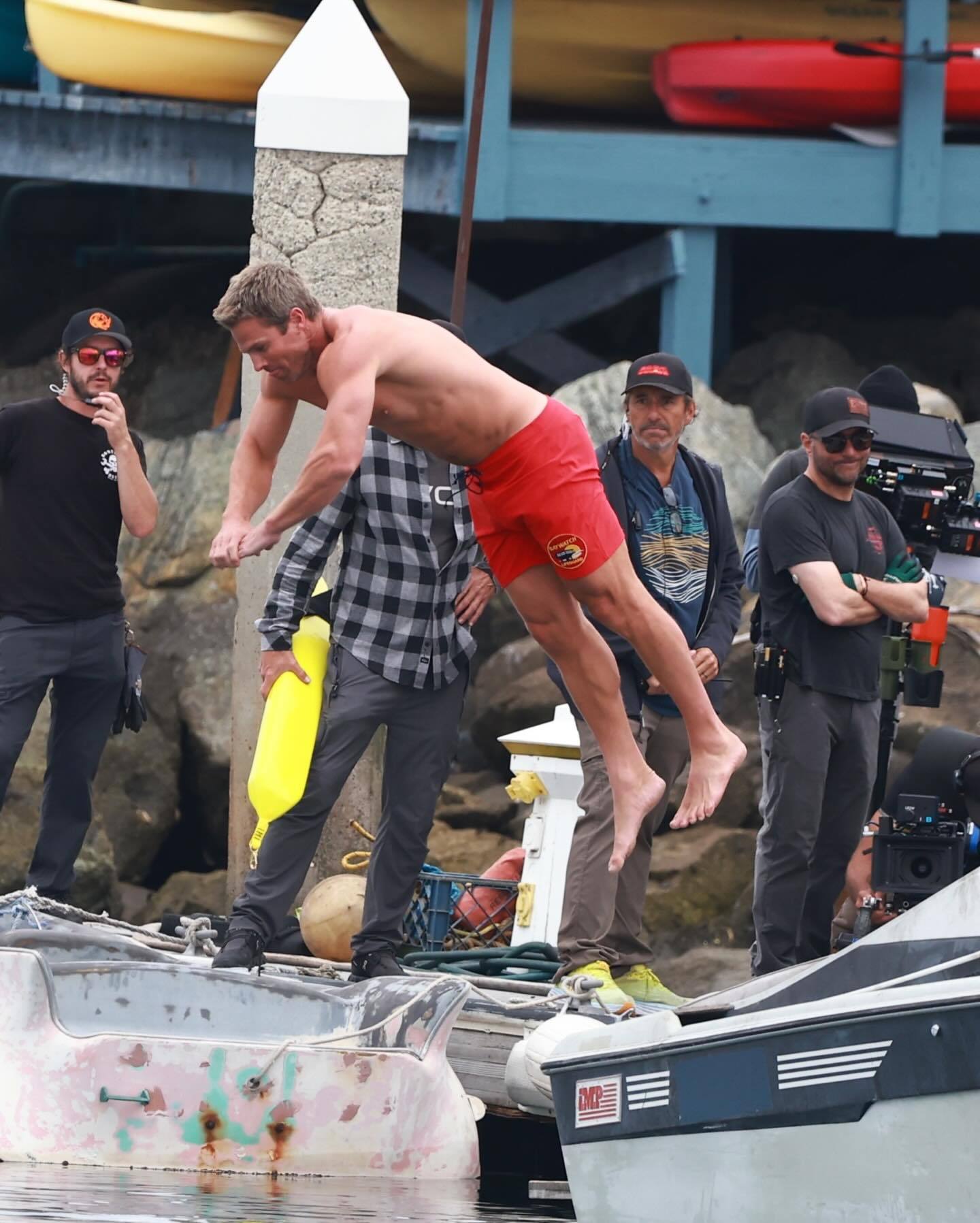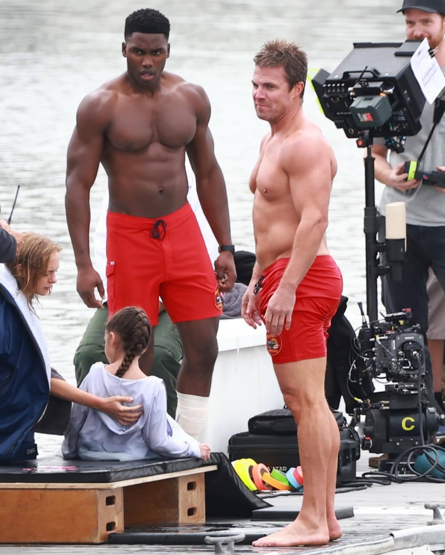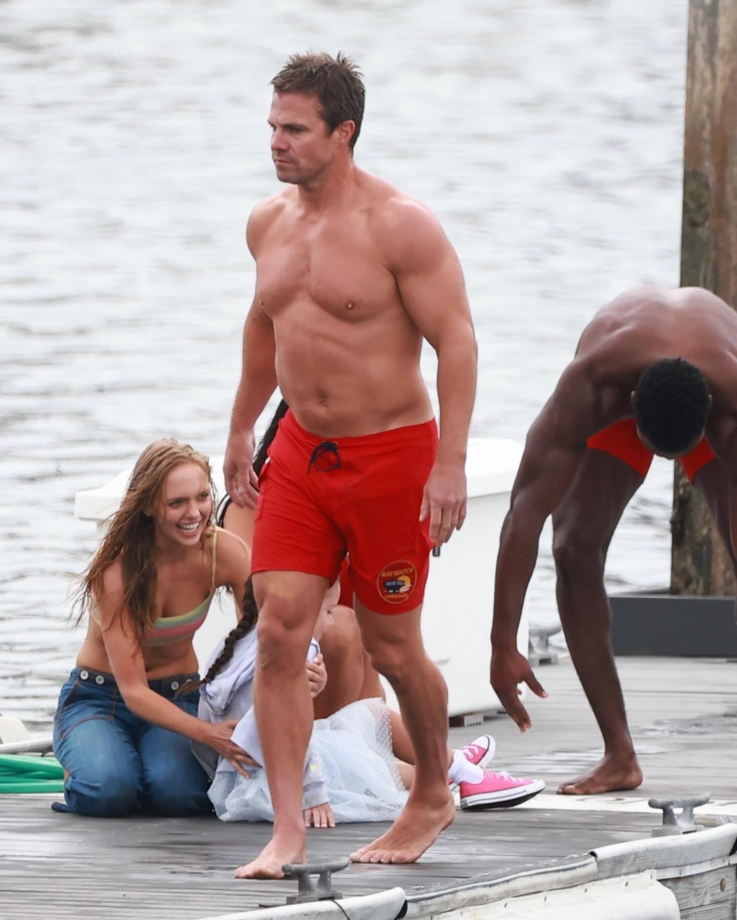「绿箭侠」Stephen Amell 昨日在加利福尼亚州雷东多海滩拍摄重启版《海滩救护队》。
