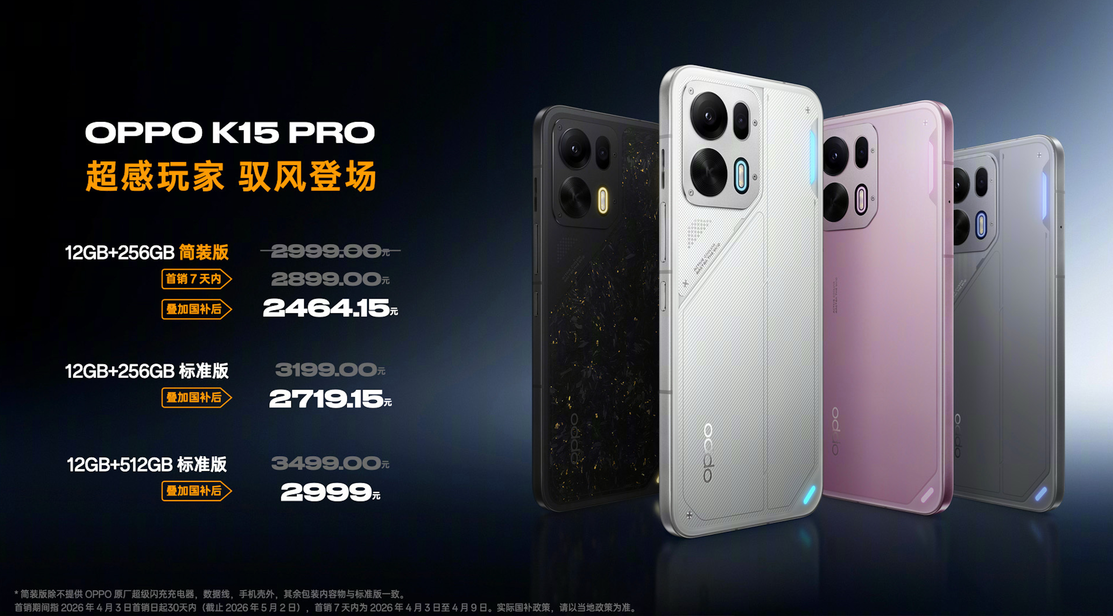 K15 Pro+标准版 12+256G 3699元(首销3499元,国补后2999元),12+512G 4199元(首销3999元,国补后3499元),简装版12+256G 3499元(首销3199元,首销7天内3099元,国补后2634.15元)......