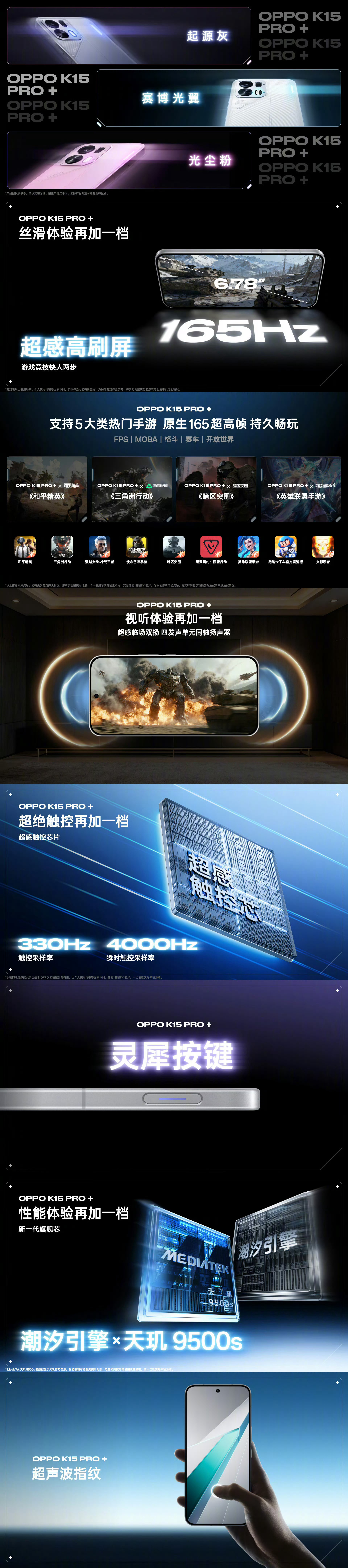 OPPO K15 Pro+:天玑 9500s 处理器,新一代疾风散热引擎,8000mAh+100W,同轴对称双扬,IP69 防尘防水,风扇 IPX9 防水,6.78 英寸 165Hz 高刷屏,3D 超声波指纹解锁,5000 万主摄、800 万超广角,1600 万前置,OPPO 山海通信、双频 GPS、三频北斗、独立网络芯片。