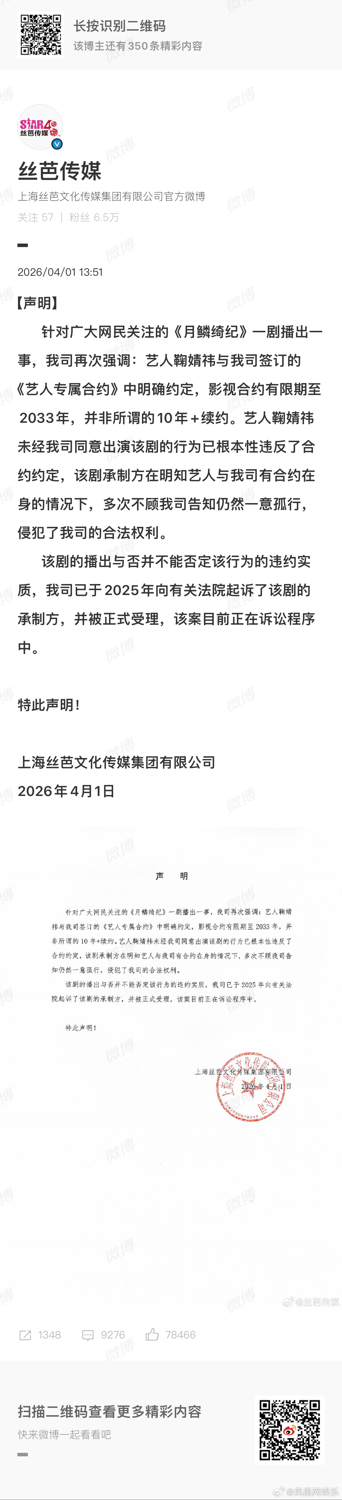 丝芭传媒称鞠婧祎根本性违反合约规定 4月1日,发声明再次强调与丝芭签订的《艺人专属合约》中明确约定,影视合约有限期至2033年。鞠婧祎未经丝芭同意就出演该剧的行为已经根本性违反了合约规定。《月鳞绮纪》的播出与否并不能否定该行为的违约实质。丝芭起诉月鳞绮纪承制方