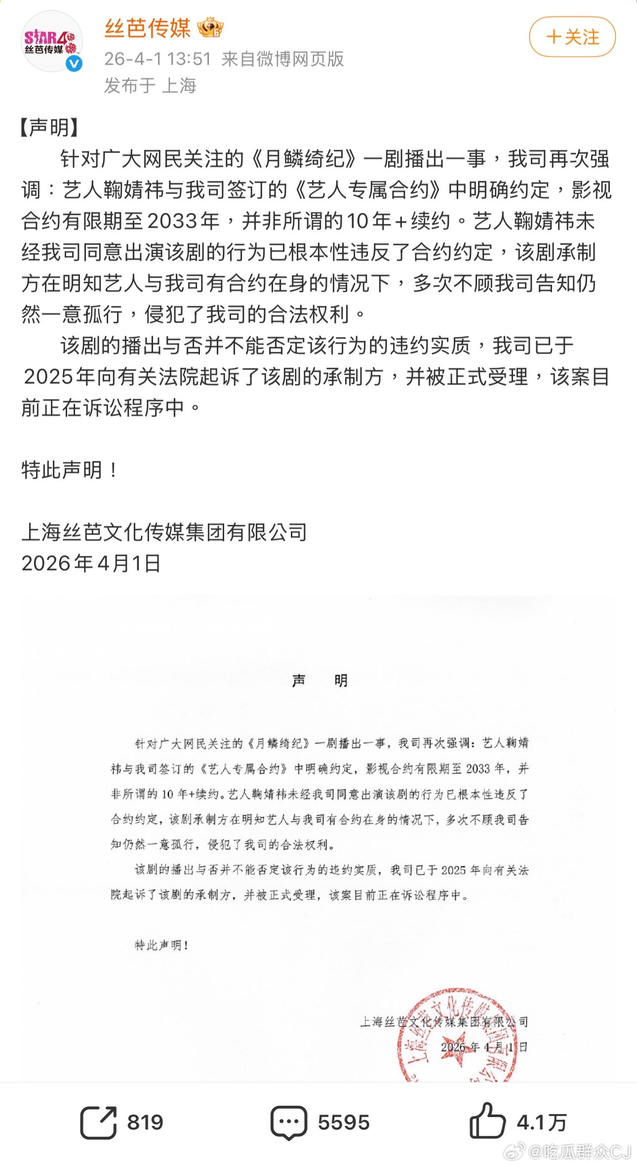 今天《月鳞绮纪》开播,丝芭又又又发声明了,强调鞠婧祎当时签的合同里明确约定了她和丝芭的影视合约是到2033年,没经过丝芭同意就演属于违约行为。丝芭起诉月鳞绮纪承制方