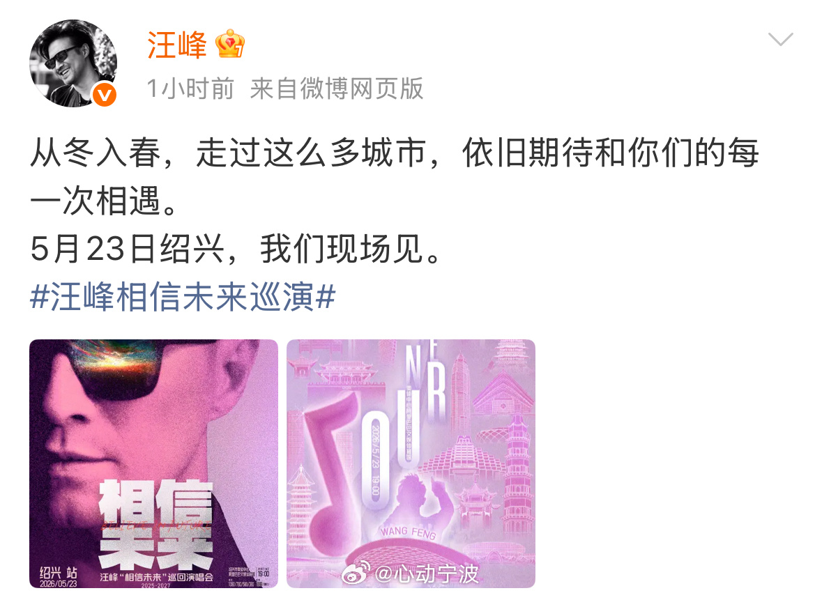 汪峰绍兴演唱会官宣 4月1日,正式官宣“相信未来”巡回演唱会绍兴站定档,这场备受期待的摇滚盛宴将于5月23日19:00登陆绍兴市奥体中心阿里巴巴文娱体育馆,为绍兴的乐迷们带来一场充满力量与信仰的音乐现场。