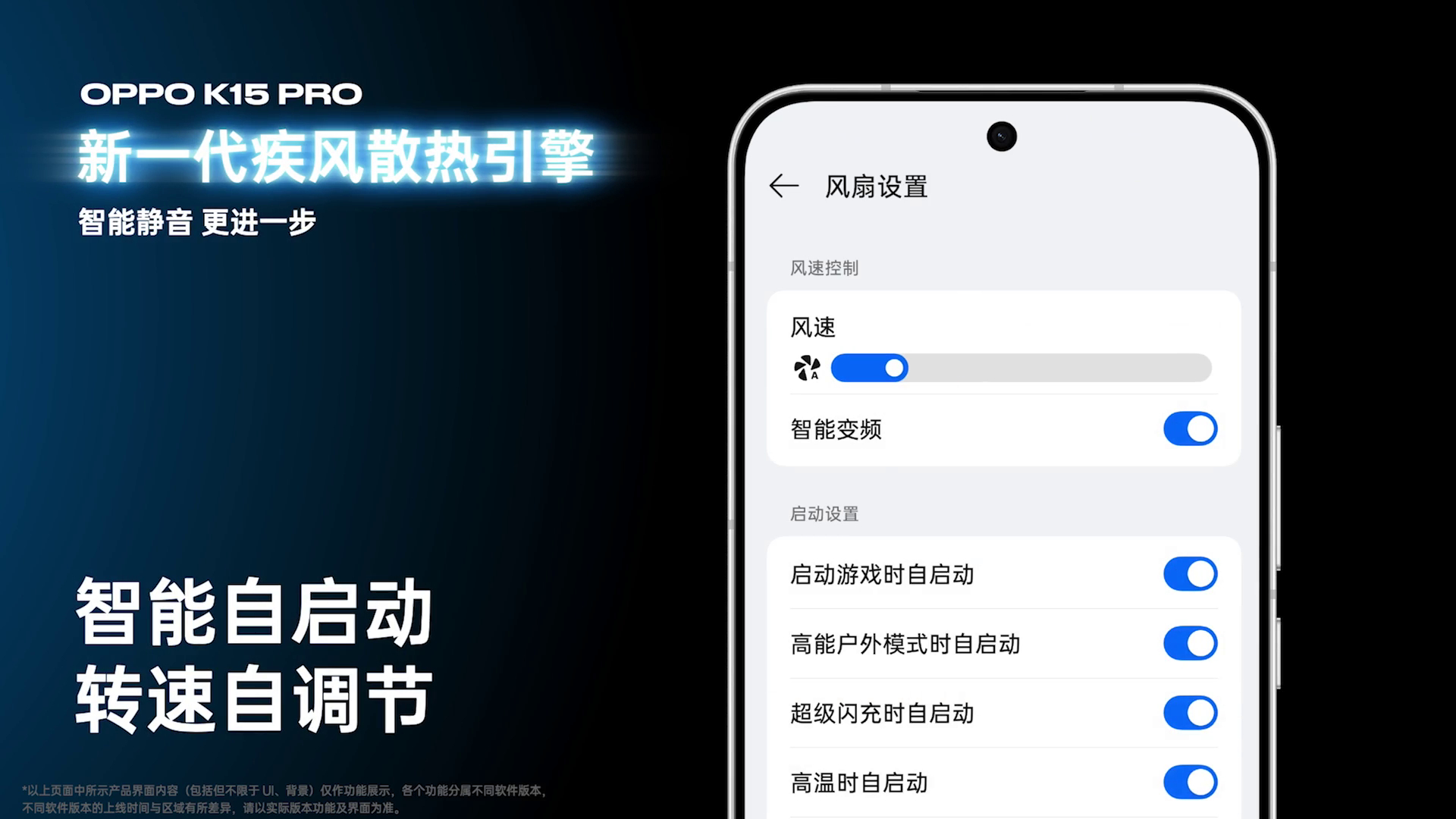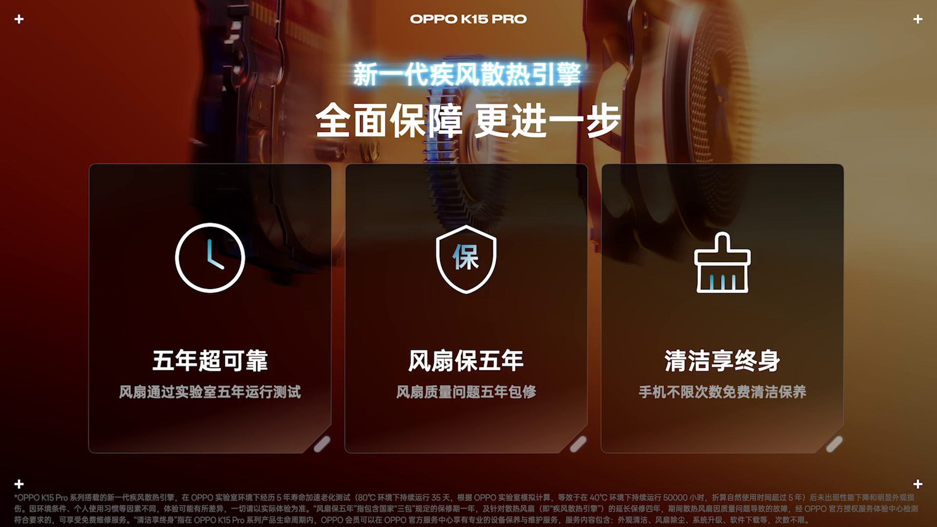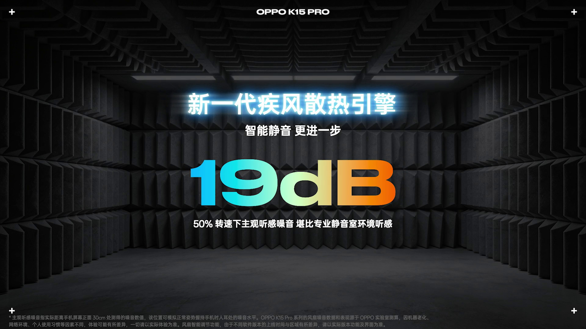 OPPO K15 Pro 系列 也内置了散热风扇,整机通过了IP69满级防尘防水测试,并通过了实验室5年运行寿命测试,五年内风扇出现问题只换不修,再送手机终身免费清洁权益。而且新一代疾风散热引擎的静音性也断崖式领先,在50%转速下,噪音甚至低至19分贝,相当于专业静音室的环境噪声。