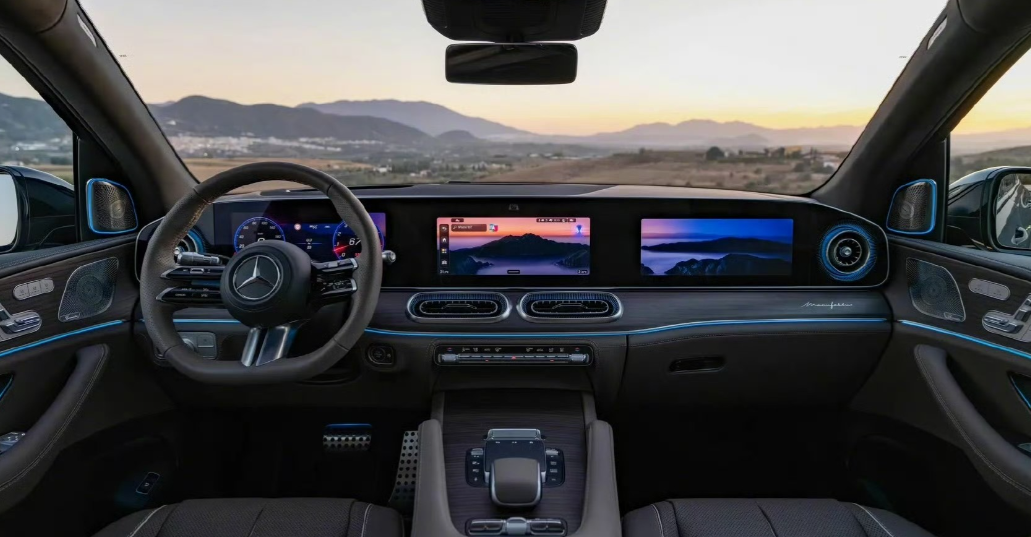 奔驰GLE和GLS改款图,也用上了三联屏。二次改款的奔驰GLE和GLS,外观采用全新奔驰家族设计风格,配备辨识度极高的三叉星行车灯,内饰的三联屏属实有点跟风国产新能源了,不知是标配还是选配。