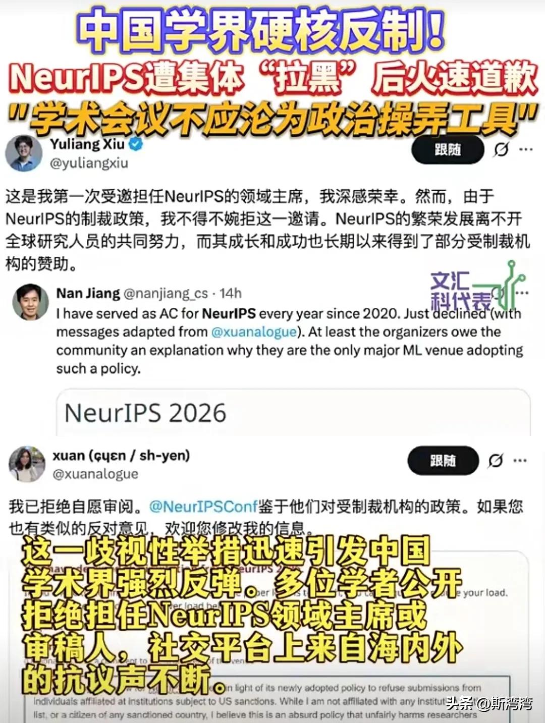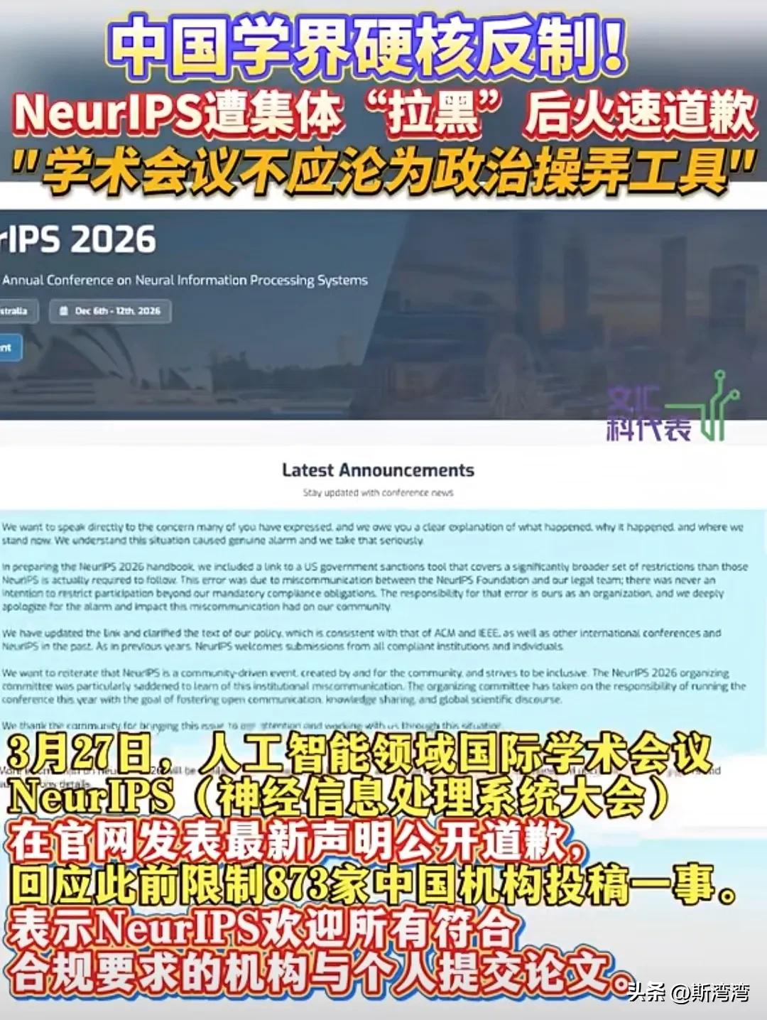 NeurIPS(神经信息处理系统大会)组织正在作死的路上狂奔! NeurIPS唯美国马首是瞻,跟风参与政治,配合美国政府打压歧视和制裁中国企业,中国学界终于硬核反制了! 现在失去了中国企业和政府的支持,得罪了中国,相信NeurIPS以后啥也不是,一个学术组织盲目追随美国参与政治,这真是自作孽不可活啊!