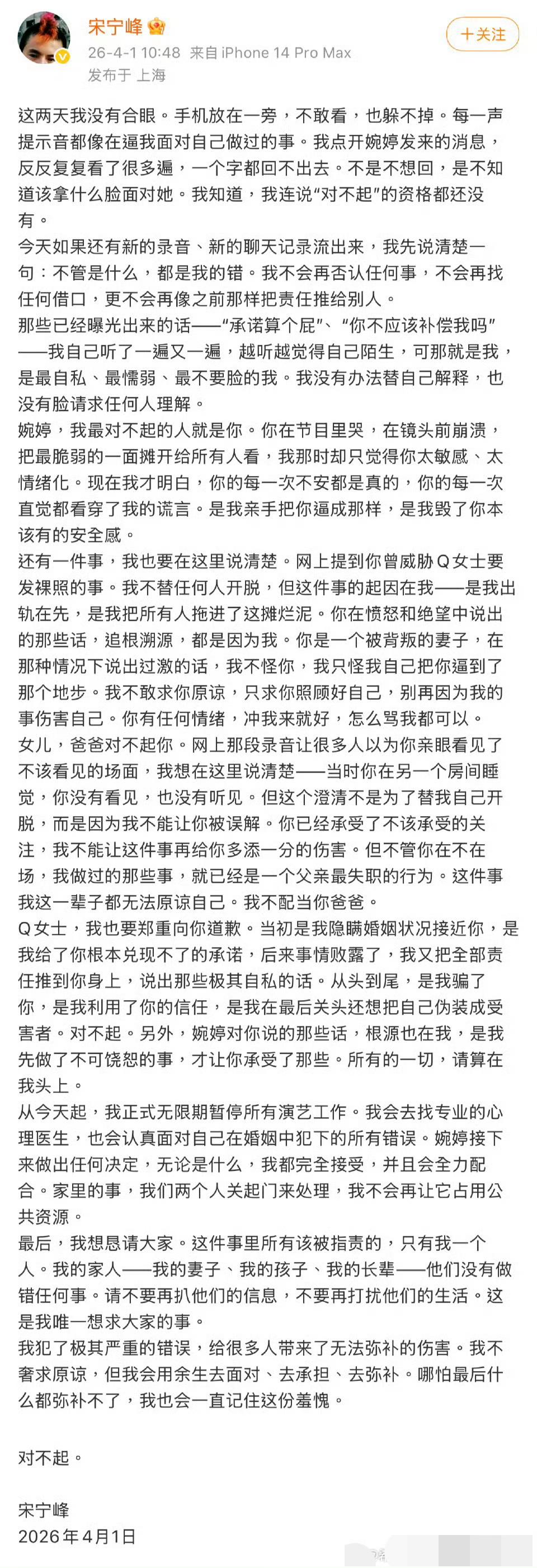 娱乐圈出轨的明星们: 文章:被拍与姚笛亲密同游,婚内出轨(妻子马伊琍); 陈赫:被曝与张子萱相恋,婚内出轨(妻子许婧),后离婚; 王力宏:被前妻李靓蕾长文控诉婚内多次出轨; 林丹:被拍与赵雅淇亲密,妻子谢杏芳孕期出轨; 汪峰:被曝与森林北等存在婚外亲密关系(婚内)。 马蓉:被曝出轨王宝强经纪人宋喆; 陈思诚:被拍夜会两名女性,婚内出轨(妻子佟丽娅); 白百何:被拍与男模亲密互动(后证实已与陈羽凡隐离); 李小璐:被曝与 PG One 亲密过夜,婚内出轨(丈夫贾乃亮); 陈翔:被毛晓彤捉奸在房,出轨江铠同; 张铭恩:被曝恋爱期间出轨胡冰卿(女友徐璐); 陶喆:承认婚后出轨杨子晴; 宋宁峰:2026年4月1日承认婚内出轨。 今天看到宋宁峰的瓜,真是让人唏嘘。 当公众视野里的“深情”人设,被婚内出轨的实锤彻底击碎,那些曾在镜头前的沉默与隐忍,此刻都成了最刺眼的讽刺。 宋宁峰向第三者描绘虚幻的未来,将承诺视作随意丢弃的筹码。东窗事发时,第一反应不是忏悔,而是试图甩锅、翻脸,把责任推给他人,自私与怯懦暴露无遗。直到舆论发酵,才终于低头,用字字恳切的道歉,承认自己的不堪,愿意承担一切后果。 可伤害的是妻子、女儿、Q女士甚至他所有的家人。婚姻的背叛,是对枕边人最残忍的辜负;情感的欺骗,是对他人真心的践踏。道歉是应有的态度,却无法抹平早已存在的裂痕。 人生没有白走的路,每一步选择都有代价。这么多年来,娱乐圈所有出轨的人都要付出代价,但还是一直有人守不住红线,你亲手推开了信任,也将为自己的行为,在家庭与人生的答卷上,写下沉重的一笔。