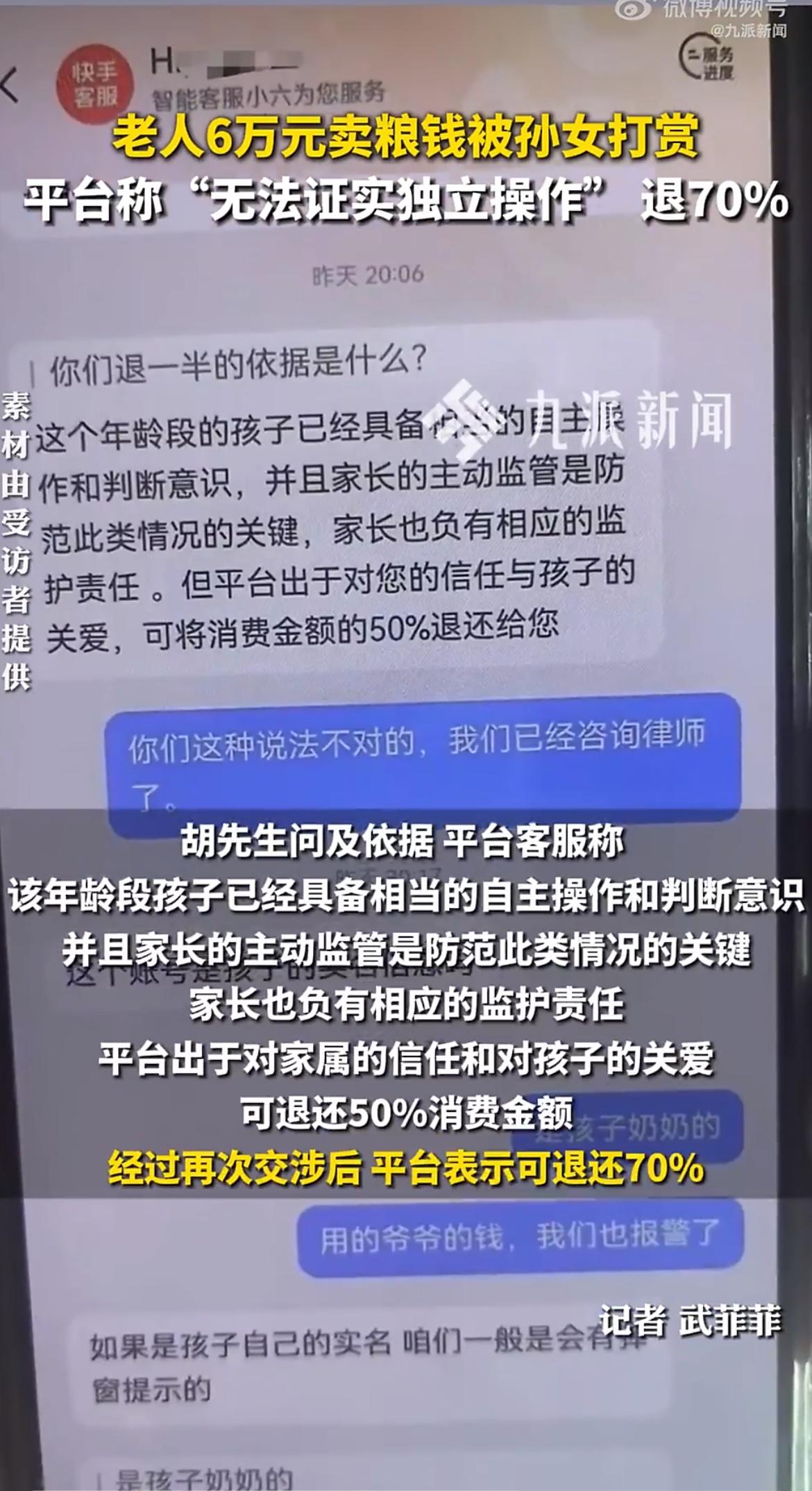 6万卖粮钱被15岁孙女打赏主播,平台竟只肯退70%!家属举证材料齐全,平台却咬死“无法证明是孩子独立操作”,难道家长还得自证“没教孩子打赏”?法律明明规定未成年人打赏可全额退款,平台凭啥扣着30%不松口? 吉林白城一位66岁的王先生,准备买化肥和种子时,发现银行卡里攒了一年的6万多元卖粮钱不翼而飞。经过查询,这笔钱被15岁的孙女可可在某直播平台打赏给了主播。 王先生表示自己不识字,也不太会用智能手机。家里的账号是用奶奶的实名注册的,之前为了抢红包绑定了他的银行卡,钱就是从这张卡里被划走的。发现钱不见后,王先生立即报警。民警建议他联系平台说明未成年人打赏的情况并申请退款,或者通过法院诉讼解决。 由于王先生对这类事不熟悉,儿子便将此事交给了从事法务工作的亲戚胡先生处理。胡先生按照平台要求提交了家长身份证、户口本、充值账单、银行流水等材料,但客服第一次只同意退50%。被问及依据时,平台客服称,15岁的孩子已经具备自主操作和判断意识,且家长负有监护责任,主动监管是防范此类情况的关键。出于对家属的信任和对孩子的关爱,平台最终决定退还50%。 胡先生对这个结果并不满意,认为6万多元是王先生一年的辛苦钱,必须争取全额退款。经过再次交涉,平台同意将退款比例提高到70%,但仍拒绝全额退还。平台给出的理由是“无法证实这笔消费是未成年人独立操作的”。 客服查询后台记录后确认,家属申请的是未成年人退款,平台已核实消费确实由未成年人完成,因此可以退款,但具体金额需要协商。当被问及为何不能全额退款时,客服再次强调,此前提交的材料无法证明消费行为完全由未成年人独立完成,因此需要进一步协商。 这件事引发了公众对未成年人打赏退款问题的讨论。根据《民法典》第19条和第145条,15岁的可可属于限制民事行为能力人,其未经监护人同意的大额打赏行为,在法律上属于效力待定的民事法律行为。如果监护人拒绝追认,平台应当全额退款。 律师指出,未成年人打赏退款有明确的法律依据。平台以“无法证实独立操作”为由拒绝全额退款,实际上加重了家属的举证责任。在类似案件中,平台通常掌握着用户操作记录、设备信息等关键证据,应当主动配合调查,而非将举证责任完全推给家属。 目前胡先生已提交新的材料,等待平台进一步审核。他表示如果协商无果,将通过法律途径维护权益。这也提醒广大家长,要加强对未成年人使用电子设备的监管,同时建议平台完善未成年人保护机制,比如设置人脸识别、消费限额等功能,从源头上减少此类纠纷的发生。 如果你觉得这个事件值得关注,点赞转发,让更多人了解未成年人打赏的法律问题,共同守护家庭财产安全!关注我,获取更多热点事件的深度解析~可爱多一点,干爽多一点 来源:九派新闻