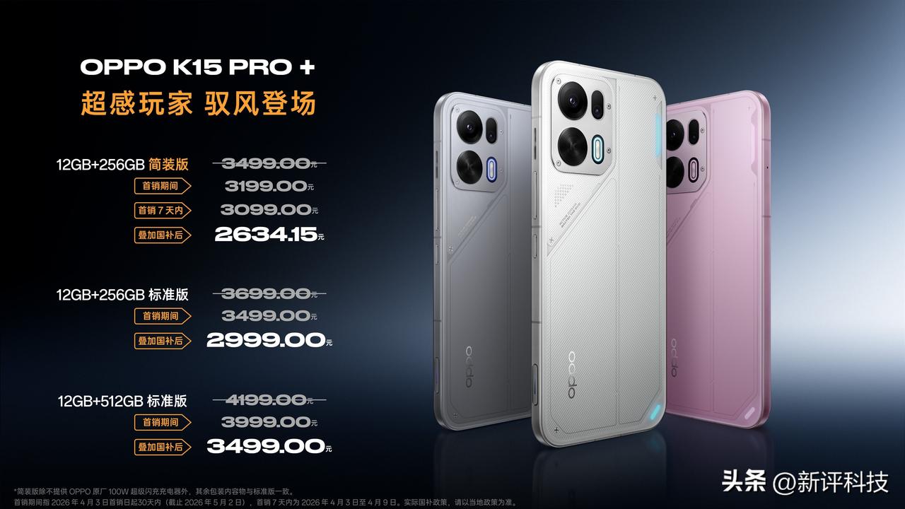 K15 Pro系列正式发布: OPPO K15 Pro 搭载天玑8500 Super处理器(最高主频3.4GHz) 6.59英寸1.5K柔性直屏(2760×1256分辨率,144Hz刷新率,1200nit峰值亮度 7500mAh冰川电池+80W快充,支持旁路供电 前置1600万像素,后置5000万主摄(OIS光学防抖)+800万超广角 主动散热风扇+4855mm²手撕钢VC液冷,风扇支持IPX9/IPX8/IPX6防水 全系金属中框+晶盾玻璃后盖,整机IP69防尘防水 搭载岚影呼吸灯(3颗RGB灯效),支持电竞光效联动 内置OPPO自研冰川电池聚能芯片,提升续航效率 售价: 12+256GB 简装版(无充电器)2899元 12+256GB 标准版 3199元 12+512GB 标准版 3499元 OPPO K15 Pro+ 天玑9500s旗舰处理器(3.73GHz主频) 6.78英寸1.5K直屏(2772×1272分辨率,165Hz刷新率) 8000mAh典型容量+100W快充 3D超声波指纹识别 金色传说配色采用航天级锻造碳工艺,Deco可磁吸替换(支持3D打印自定义) 支持疾风散热超级套装(全域液冷磁吸壳+40W散热器) 售价: 12+256GB 简装版 3099元 12+256GB 标准版 3499元 12+512GB 标准版 3999元
