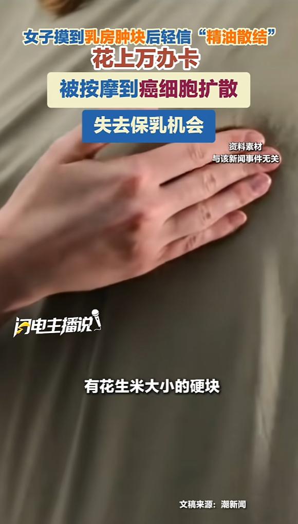 “悲剧还是发生了!”浙江绍兴,一女子洗澡时,摸到右侧乳房有个硬块,不痛不痒,本想去医院,但美容院说可以用手法把结节揉散,女子深信不疑,花了上万元办卡,结果最后肿块变大,去医院才发现癌细胞已经扩散!网友:太吓人了! 医生的话语还在耳边回响,恶性肿瘤已发生腋窝淋巴结转移,常规保乳手术已无可能,必须切除右侧全部乳腺组织并进行淋巴结清扫。 这个结果,彻底击碎了张女士的所有期待,而这一切的根源,都是她当初那一个轻信的决定。人们不禁疑惑,她为何会放弃正规医院,转而选择美容院的“手法散结”? 时间拉回到去年底,身为绍兴某企业业务主管的张女士,日常工作节奏快、压力大,很少有时间关注自身健康。一次洗澡时,她无意间摸到右侧乳房有一个花生米大小的硬块,触感偏硬但毫无痛感,按压时也没有明显不适。起初,她并没有太过在意,只当是普通的乳腺增生。 没过几天,硬块依然存在,张女士便打算抽时间去医院做个检查,图个安心。可还没等她安排好时间,一次去美容院做肩颈放松时,她随口提起了自己乳房有硬块的事,没曾想,这一句话竟成了悲剧的开端。 美容院的操作人员听完后,立刻表现出一副经验丰富的模样,一番“诊断”后给出了说法。 操作人员告诉张女士,这个硬块是肝气郁结、经络不通导致的乳腺结节,不用吃药、不用开刀,只要通过专业的手法按摩,再配合美容院的专用精油,就能把结节彻底揉散,把体内的毒素排出来。这番话,正好戳中了张女士怕麻烦、怕手术的心理。 看着操作人员信誓旦旦的样子,再想到去医院要排队、做检查、可能还要吃药,张女士动了心。在操作人员的极力推荐下,她毫不犹豫地花上万元,办理了美容院的“顶级胸部疏通理疗卡”,满心期待着硬块能在按摩中慢慢消失。可她不知道,自己亲手为自己埋下了致命的隐患。 从那以后,张女士每周都会准时前往美容院,接受操作人员的大力推拿、揉搓和热敷。起初的几次按摩,她只觉得胸部有些酸胀,操作人员解释说是经络正在疏通,属于正常反应,让她不必担心。张女士对此深信不疑,依旧按时打卡按摩,丝毫没有察觉异常。 就这样坚持了近三个月,张女士渐渐发现不对劲。原本花生米大小的硬块,不仅没有消散,反而越长越大,已经涨到了红枣大小,触感也变得像石头一样坚硬。更让她不安的是,右侧胸部开始出现明显的胀痛感,按压时疼痛难忍,甚至影响到了日常活动。 她连忙询问美容院的操作人员,对方却依旧安抚她,说这是结节正在“散开”的正常过程,让她再坚持一段时间,很快就能看到效果。被忽悠的张女士,又一次选择了相信,继续接受按摩,可她不知道,癌细胞正在她的体内悄悄扩散。 又过了半个月,张女士的症状越来越严重,右侧乳房的皮肤出现了像橘子皮一样的坑洼,用手触摸时,能明显感觉到皮肤粗糙不平,而且右侧腋窝处也摸到了几个小小的硬疙瘩。这时的她,终于意识到事情不对劲,再也不敢相信美容院的说法。 在家人的陪伴下,张女士急匆匆赶到浙江省人民医院越城院区,挂了乳腺外科的号。接诊的副主任医师李永峰,在触诊后脸色瞬间凝重,凭借多年的临床经验,他已经察觉到情况不妙,立刻安排张女士做了超声和穿刺活检检查。 等待检查结果的那几天,张女士坐立难安,脑海里反复回想自己按摩的场景,心中充满了悔恨。她无数次假设,如果当初没有轻信美容院的话,第一时间就去医院检查,是不是一切都会不一样?可世上没有后悔药,检查结果很快就出来了,给了她最沉重的一击。 检查结果显示,张女士右侧乳房的硬块并非普通结节,而是乳腺浸润性癌,且癌细胞已经发生了腋窝淋巴结转移。李永峰医生痛心地表示,刚摸到硬块时,癌细胞很可能还处于早期,正是这几个月不科学的暴力按摩,加速了癌细胞的扩散。 医生用一个形象的比喻解释了其中的原理:乳房是布满血管和淋巴管网的娇嫩器官,恶性肿瘤就像一个装满坏细胞的水球,暴力按摩会挤破肿瘤包膜,把癌细胞像挤牙膏一样,推进血液和淋巴管,导致其快速扩散。 更可怕的是,美容院使用的精油,大多含有雌激素,会进一步刺激癌细胞生长。 张女士的遭遇并非个例,类似的悲剧在全国各地不断上演。合肥一位刘女士,发现乳房有龙眼大小的硬结后,听信美容院的按摩散结说法,几个月后肿物增大,腋窝出现硬结,最终被确诊为乳腺癌伴淋巴转移,只能切除乳房并接受放化疗。 万幸的是,李永峰医生团队经过多学科协作讨论,为张女士实施了右乳癌改良根治术+一期乳房自体组织重建术,既彻底清除了病灶,又为她重建了乳房,最大限度减少了身体和心理的伤害。但即便如此,后续的放化疗、复查,依然要伴随她很长一段时间。 事件曝光后,网友们纷纷表示震惊和愤怒,有人痛斥美容院的虚假宣传,有人为张女士的遭遇感到惋惜,也有人反思自己是否也曾有过类似的侥幸心理。 说到底,这场悲剧本可以避免,可为什么还是发生了?如果是你,摸到乳房硬块后,会第一时间去医院检查,还是会轻信美容院的忽悠?