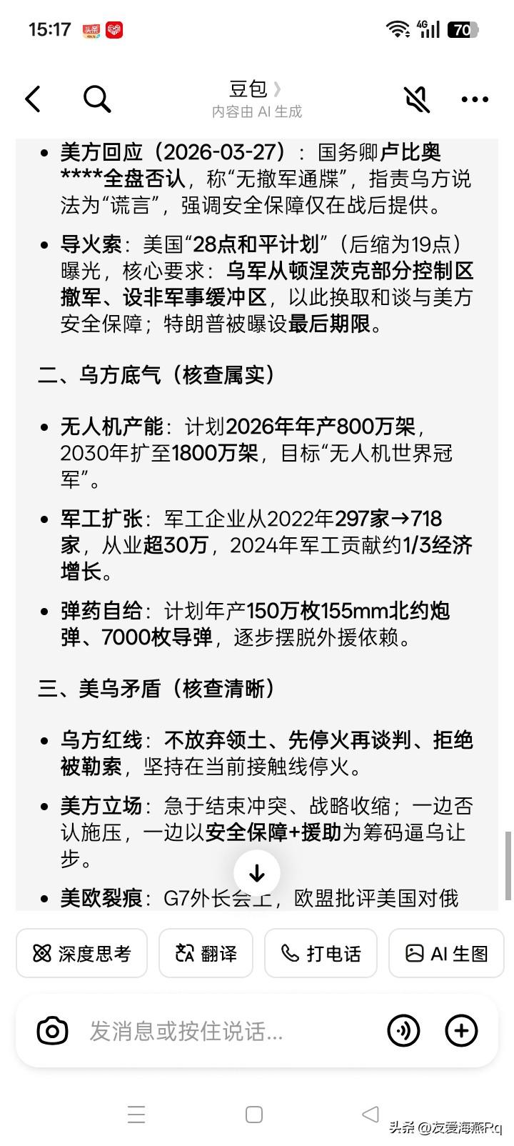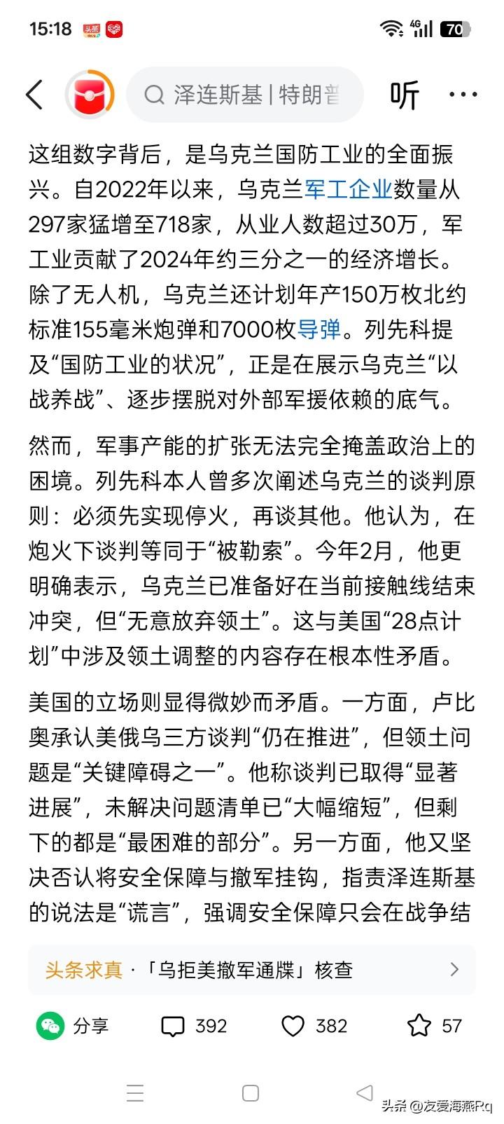 乌克兰的底气? 美国一再要求乌克兰军队从顿巴斯地区撤离,将撤离后的地区作为缓冲区,因此与俄罗斯达成停战协议。虽然美国国务卿卢比奥对此矢口否认,但好像美国总统特朗普确实对乌克兰有此要求。 顿巴斯地区是乌克兰的领土,显而易见,乌克兰军队干嘛要服从别人的意愿和要求,从自己的土地上撤军。因为乌克兰好像已经有了差不多足够的底气,这就是要在2026年制造、生产800万架无人机,到2030年更是增加生产到1800万架无人机。 各种火炮可以打到的地方,无人机也可以打到,火炮打不到的地方,估计无人机还可以打到。一般导弹可以打到的地方,无人机也可以打到。除了还不能够拦截击落导弹的袭击,无人机现在几乎无所不能,远打武器弹药仓库、军工企业、炼油厂、油库等等,上拦截击落无人机,下炸坦克、装甲战车、袭击火炮阵地,猎杀无论是骑摩托车的、还是徒步的士兵。 假如乌克兰在2026年真的是能够生产800万架作战无人机,用得着低三下四的撤军退让吗?