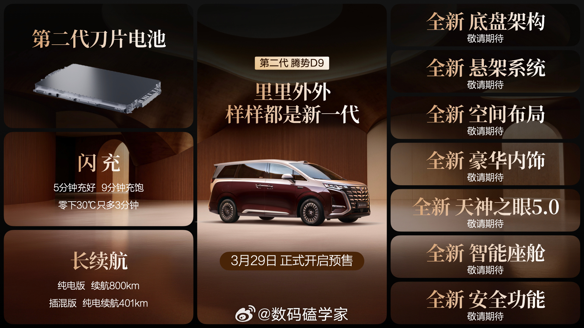 期待已久的第二代腾势D9终于开启预售了,预计起售价在38.98万左右,新款D9也是换上了第二代刀片电池 ,插混版的纯电续航直接干到了401公里,纯电版更是有800公里的长续航 。 当然这次最大的升级还是闪充技术,官方说5分钟就能充好,9分钟充饱,就算是零下30度的东北冬天,也就多花3分钟而已,这对经常跑长途或者有里程焦虑的朋友来说,确实是个痛点大升级。车内体验也提升了不少。前排变成了怀挡设计,副驾多了一块可以翻折的智能娱乐屏,平时刷视频看电影都很方便,细节做得很到位 。中排座椅升级成了零压云绒材质,带按摩和电动调节,坐进去包裹感非常强 。至于智驾方面,全系标配了天神之眼5.0系统 ,开起来肯定比上一代更省心。目前看下来的配置其实只是冰山一角,底盘、悬架这些核心大件的升级还得等正式上市才能揭晓 。对于既要照顾家用又要兼顾商务接待的朋友来说,这台车综合表现确实能打。你们觉得这个预售价符合你的心理预期吗?